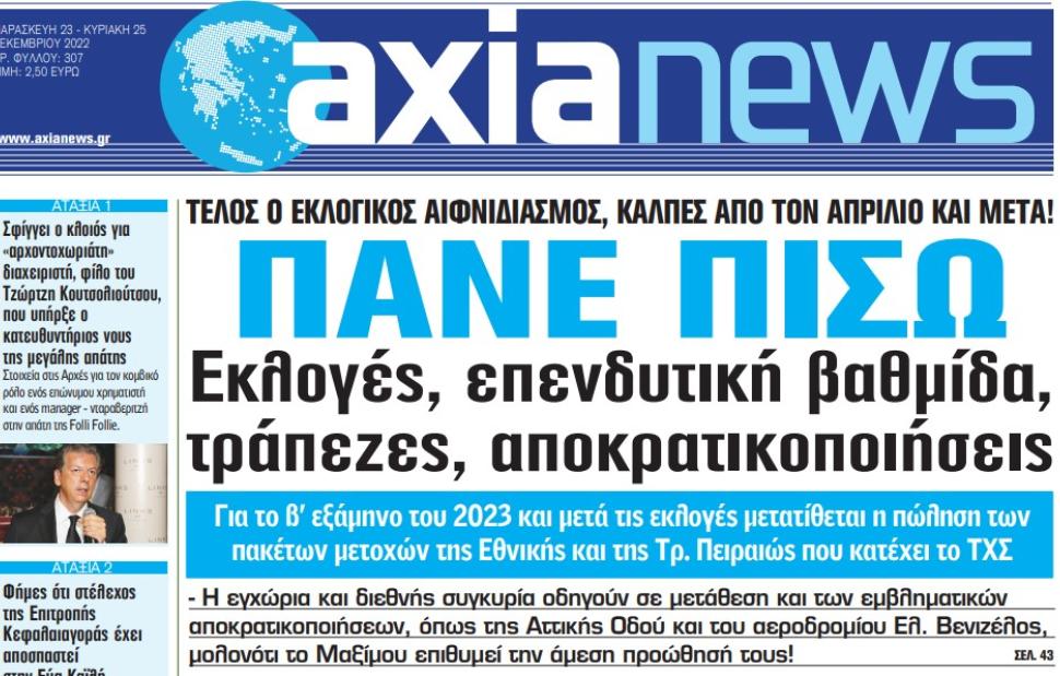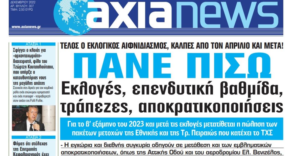 Με τίτλο: «Πάνε πίσω Εκλογές, επενδυτική βαθμίδα, τράπεζες, αποκρατικοποιήσεις», κυκλοφορεί εκτάκτως αύριο, Παρασκευή 23 Δεκεμβρίου, η «Axianews».