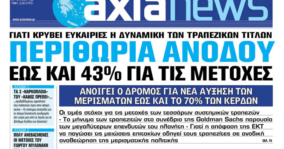 Με τίτλο: «Περιθώρια ανόδου έως και 43% για τις μετοχές» κυκλοφορεί η «Axianews» το Σάββατο 14 Ιουνίου.