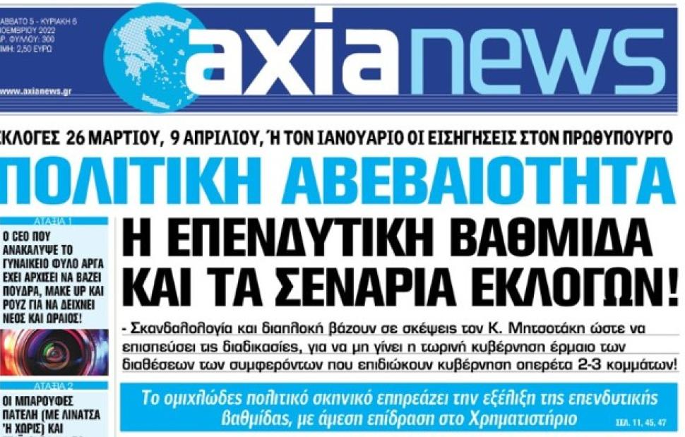 Με τίτλο: «Πολιτική αβεβαιότητα – Η επενδυτική βαθμίδα και τα σενάρια των Εκλογών!» κυκλοφορεί αύριο, Σάββατο 5 Νοεμβρίου, η «Axianews».