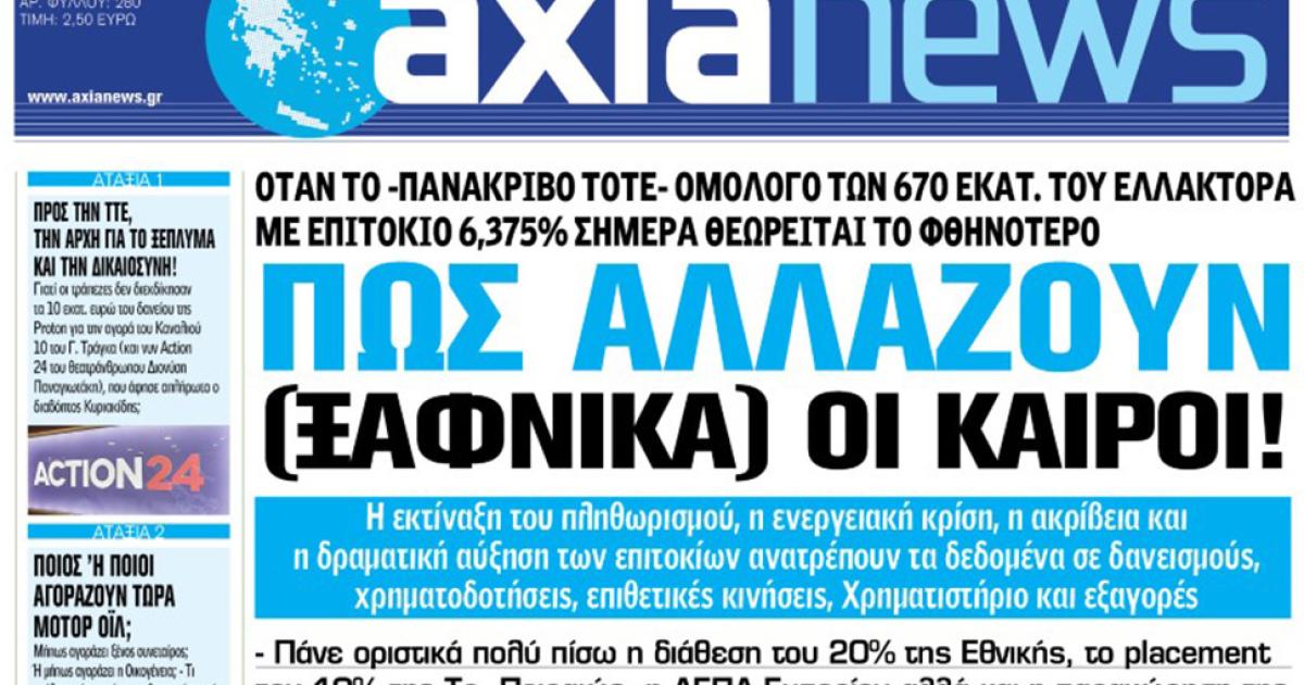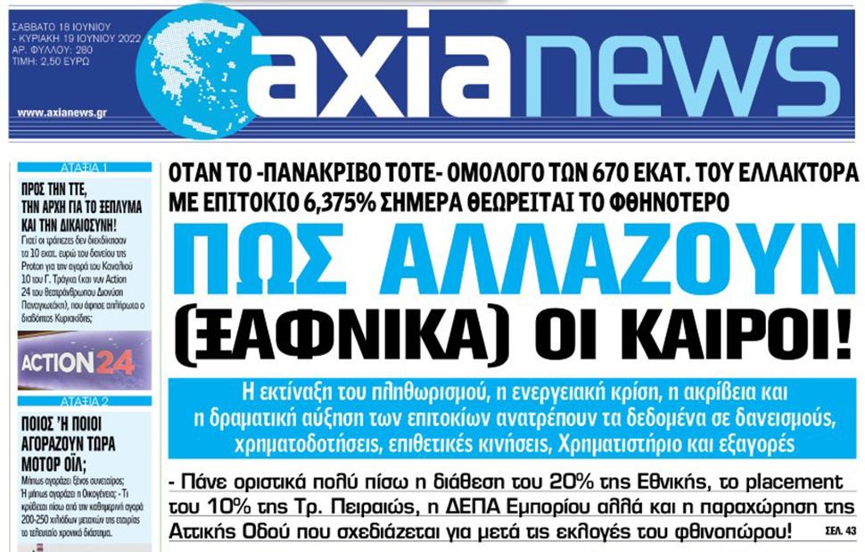 Με τίτλο: «Πως αλλάζουν (ξαφνικά) οι καιροί!» κυκλοφορεί αύριο, Σάββατο 18 Ιουνίου, η «Axianews».