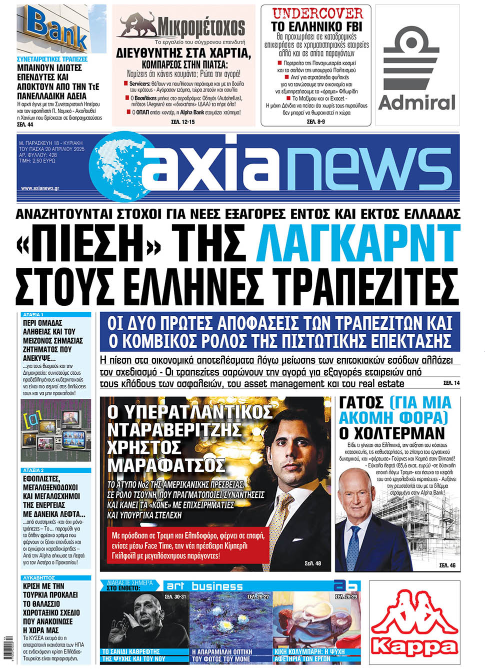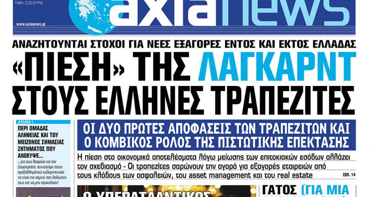Με τίτλο: «"Πίεση" της Λαγκάρντ στους Έλληνες τραπεζίτες» κυκλοφορεί η «Axianews» εκτάκτως την Μεγάλη Παρασκευή 18 Απριλίου.