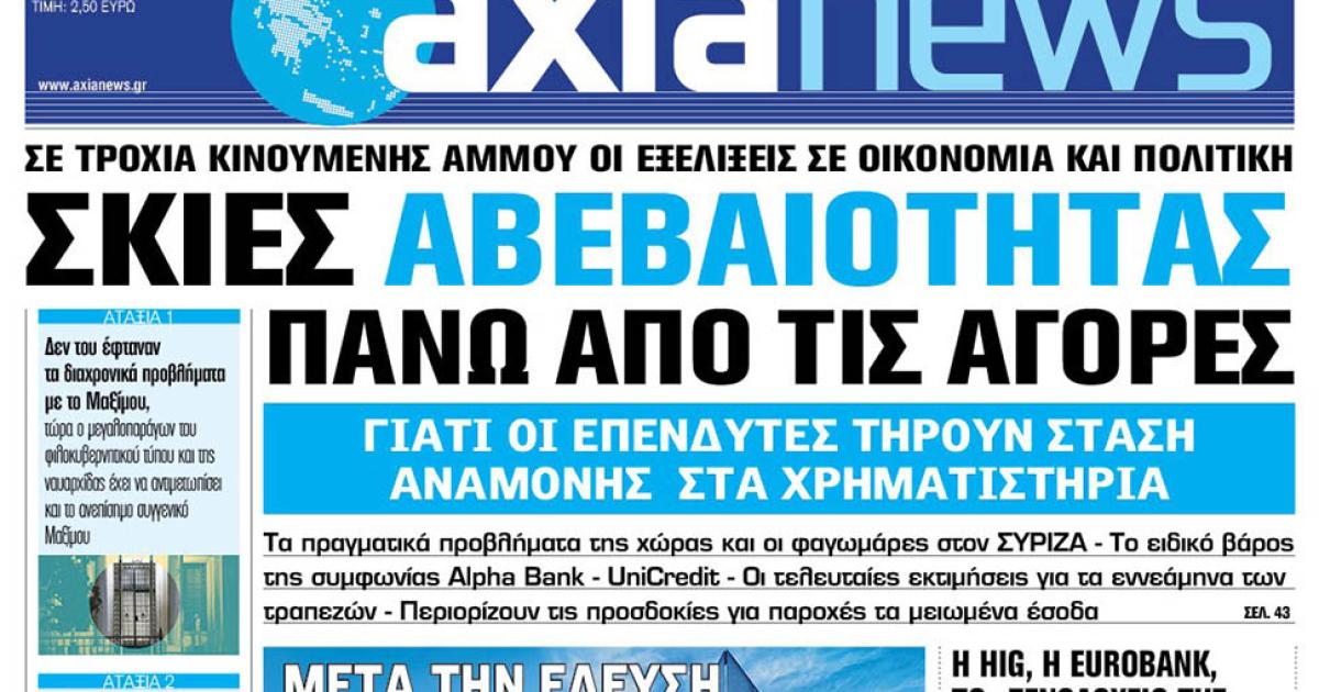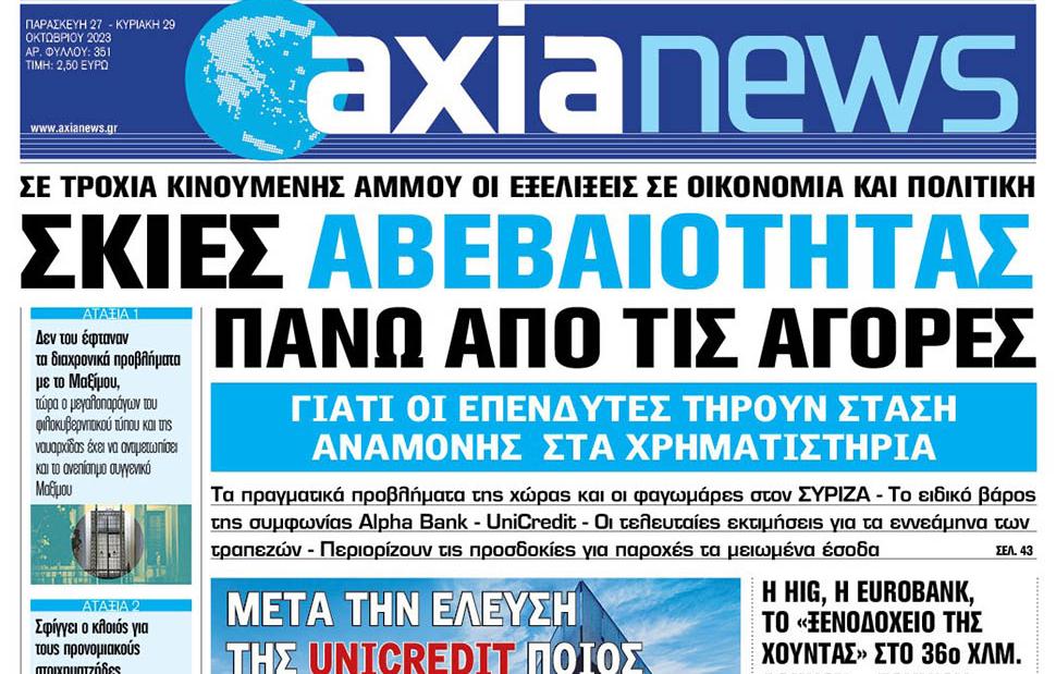 Με τίτλο: «Σκιές αβεβαιότητας πάνω από τις αγορές» κυκλοφορεί εκτάκτως αύριο, Παρασκευή 27 Οκτωβρίου η «Axianews».