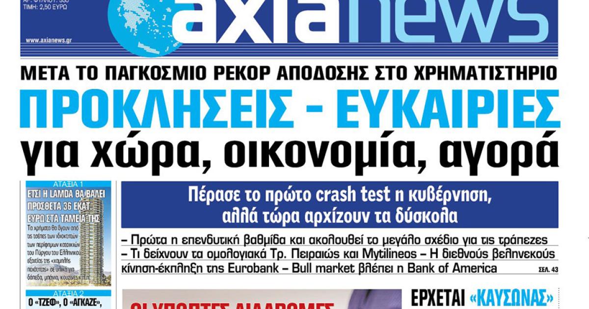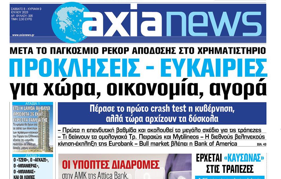 Με τίτλο: «Προκλήσεις - ευκαιρίες για χώρα, οικονομία, αγορά» κυκλοφορεί αύριο, Σάββατο 8 Ιουλίου, η «Axianews».