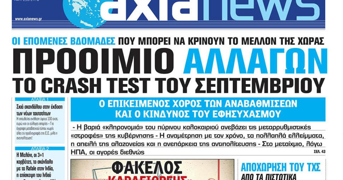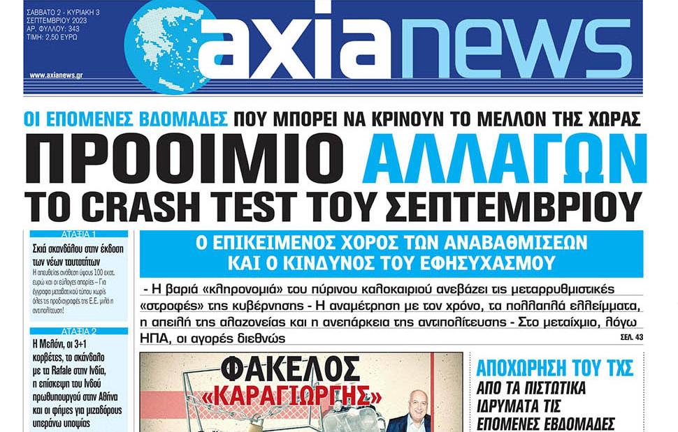 Με τίτλο: «Προοίμιο αλλαγών το crash test του Σεπτεμβρίου» κυκλοφορεί αύριο, Σάββατο 2 Σεπτεμβρίου η «Axianews».