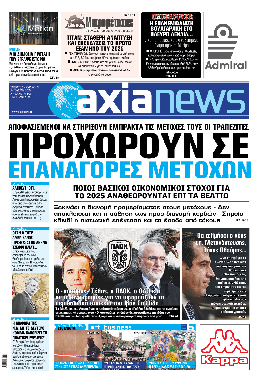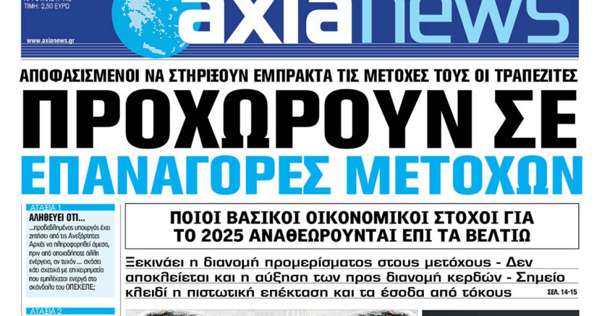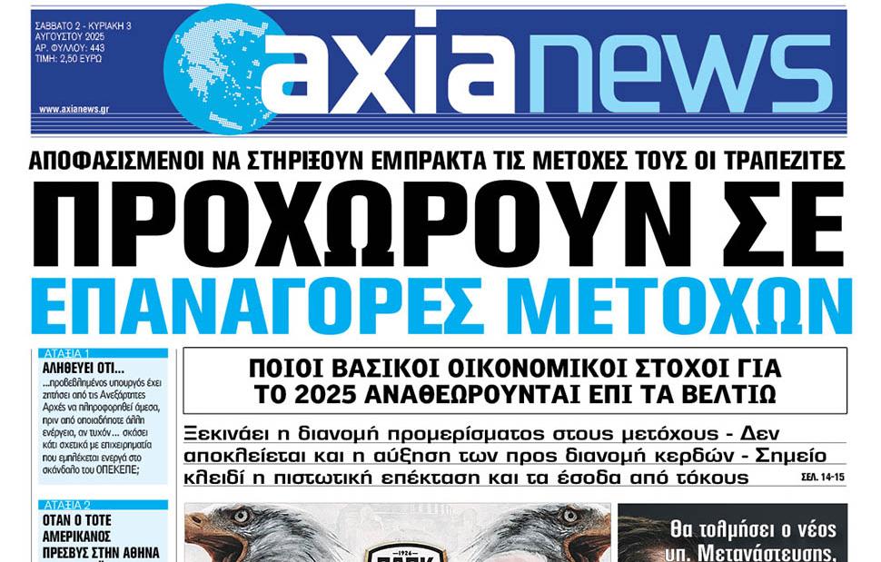 Με τίτλο: «Προχωρούν σε επαναγορές μετοχών» κυκλοφορεί η «Axianews» το Σάββατο 2 Αυγούστου.