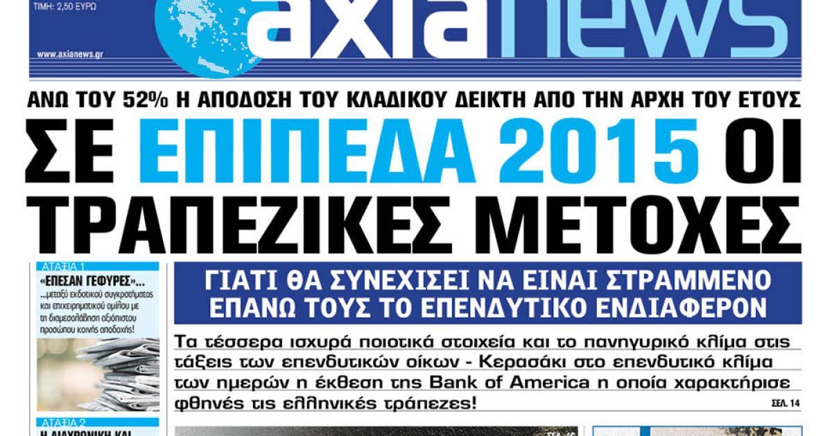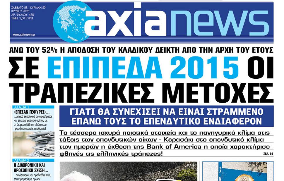 Με τίτλο: «Σε επίπεδα 2015 οι τραπεζικές μετοχές» κυκλοφορεί η «Axianews» το Σάββατο 28 Ιουνίου.