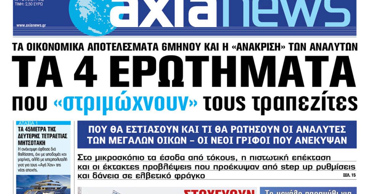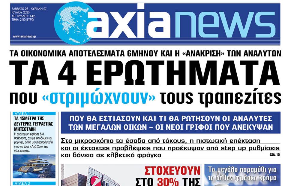 Με τίτλο: «Τα 4 ερωτήματα που "στριμώχνουν" τους τραπεζίτες» κυκλοφορεί η «Axianews» το Σάββατο 26 Ιουλίου.