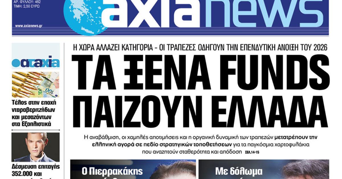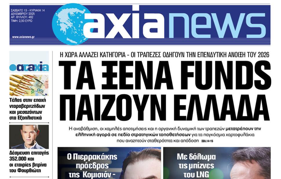 Με τίτλο: «Τα ξένα funds παίζουν Ελλάδα» κυκλοφορεί αύριο, Σάββατο 13 Δεκεμβρίου, η «Axianews».