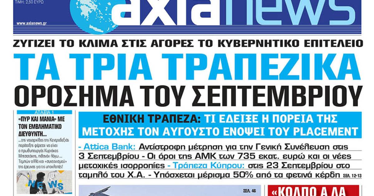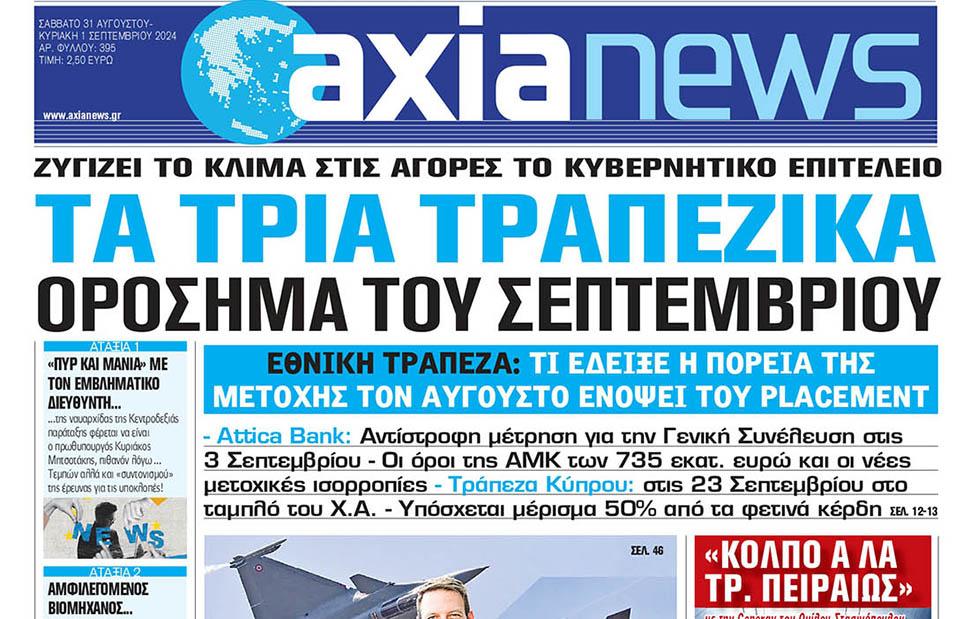 Με τίτλο: «Τα τρία τραπεζικά ορόσημα του Σεπτεμβρίου» κυκλοφορεί αύριο, Σάββατο 31 Αυγούστου, η «Axianews».