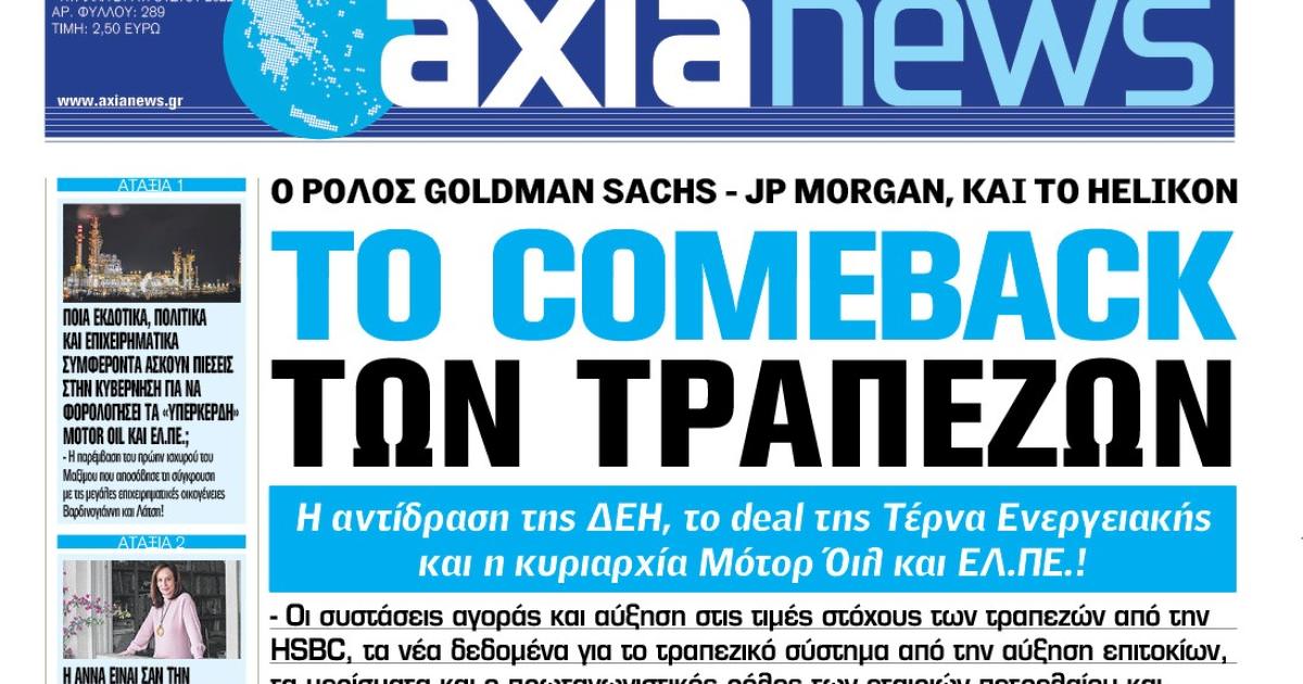 Με τίτλο: «To Comeback των τραπεζών» κυκλοφορεί αύριο, Σάββατο 20 Αυγούστου η «Axianews».