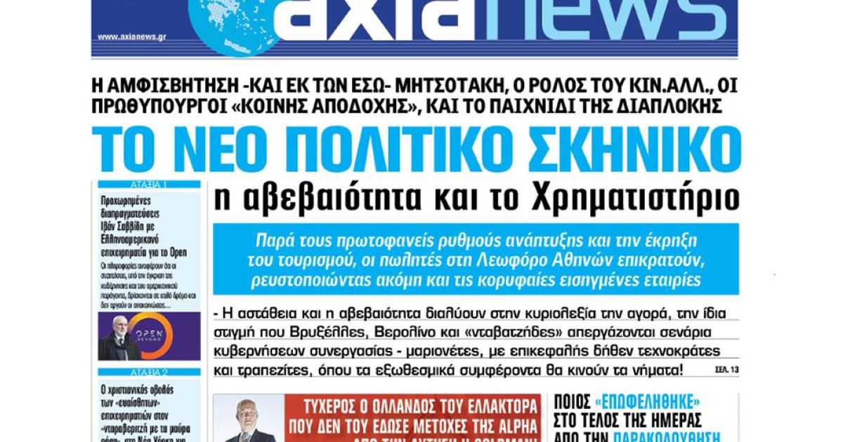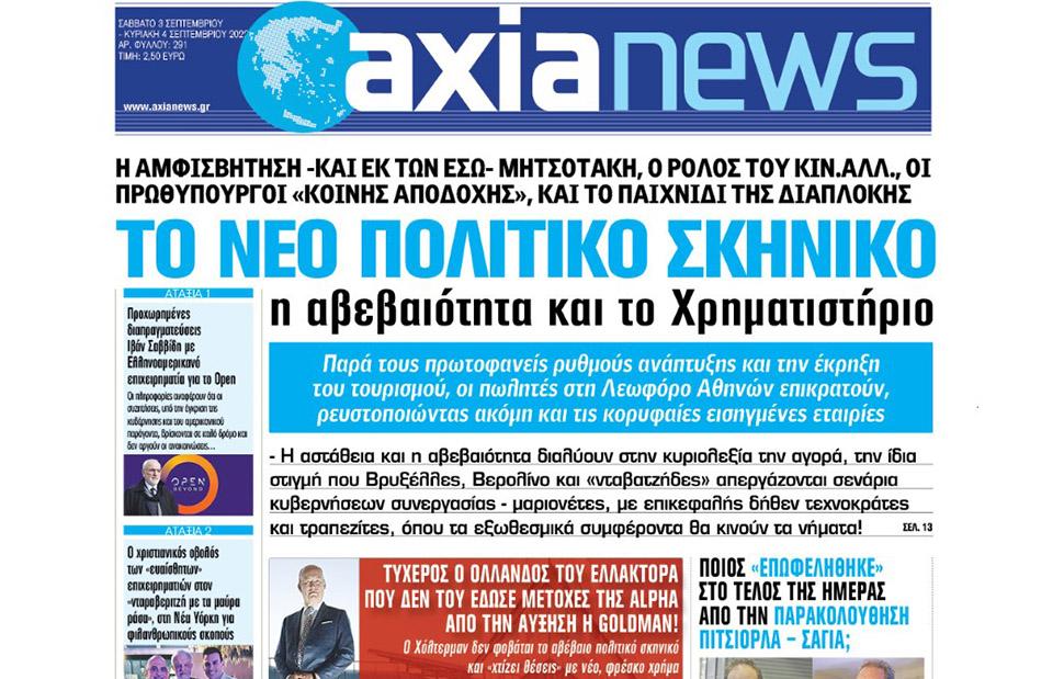 Με τίτλο: «Το νέο πολιτικό σκηνικό, η αβεβαιότητα και το Χρηματιστήριο» κυκλοφορεί αύριο, Σάββατο 3 Σεπτεμβρίου η «Axianews».