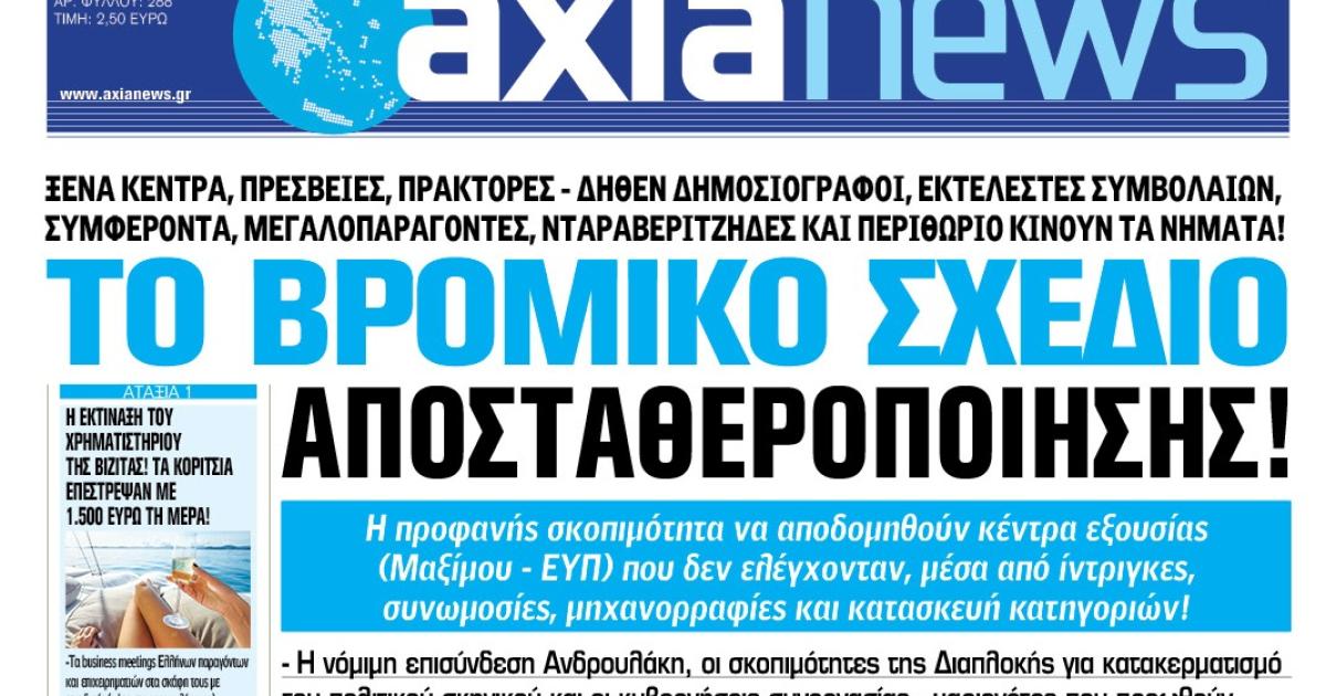 Με τίτλο: «Το βρόμικο σχέδιο αποσταθεροποίησης!» κυκλοφορεί αύριο, Σάββατο 11 Αυγούστου η «Axianews».