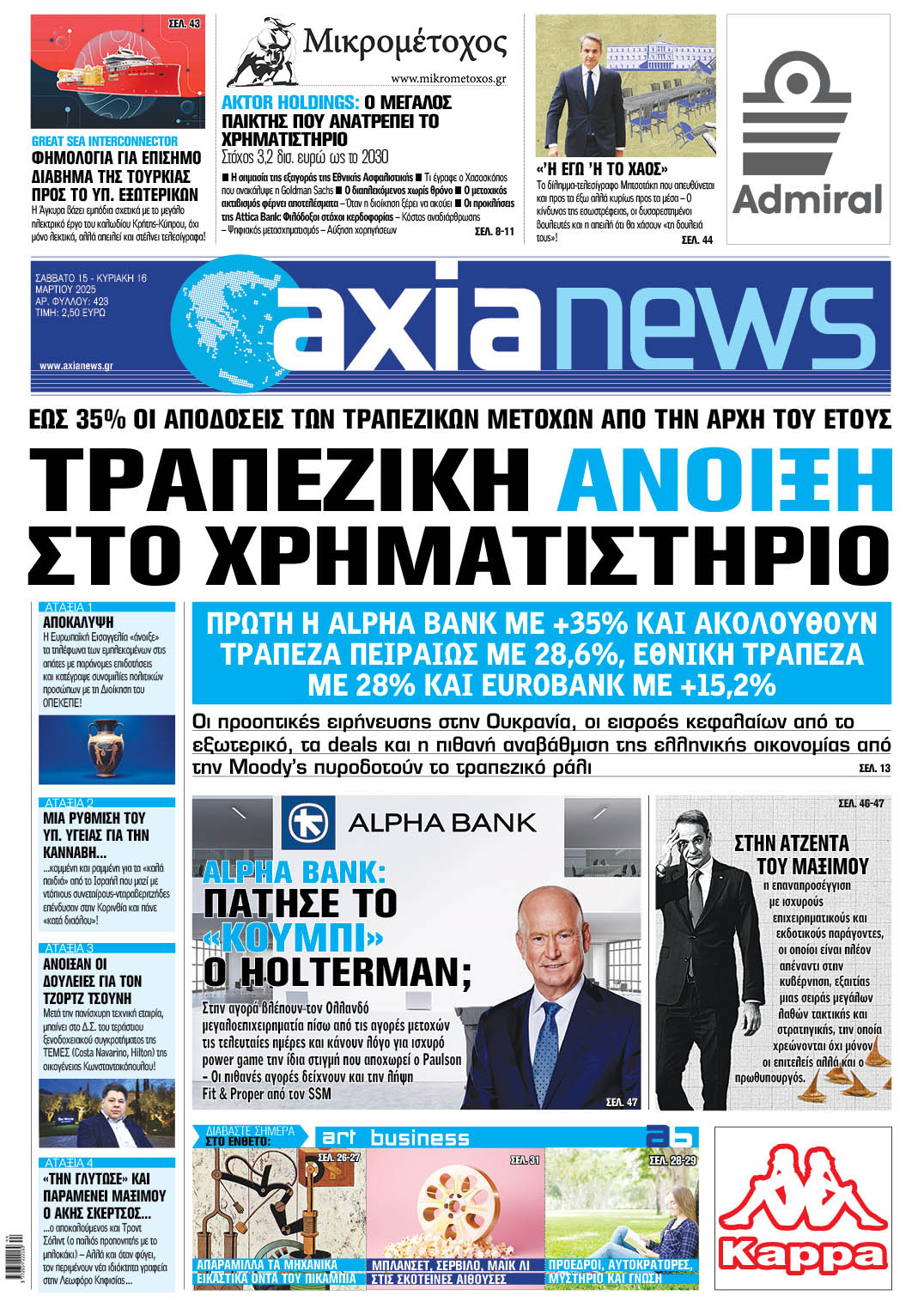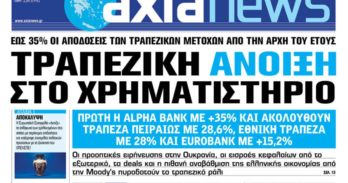 Με τίτλο: «Τραπεζική άνοιξη στο Χρηματιστήριο» κυκλοφορεί η «Axianews» το Σάββατο 15 Μαρτίου.