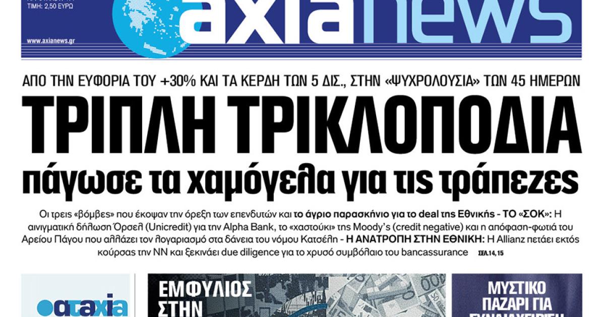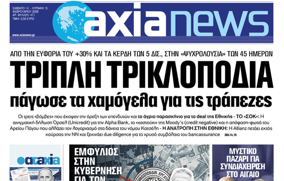 Με τίτλο: «Τριπλή τρικλοποδιά πάγωσε τα χαμόγελα για τις τράπεζες» κυκλοφορεί αύριο, Σάββατο 14 Φεβρουαρίου, η «Axianews».