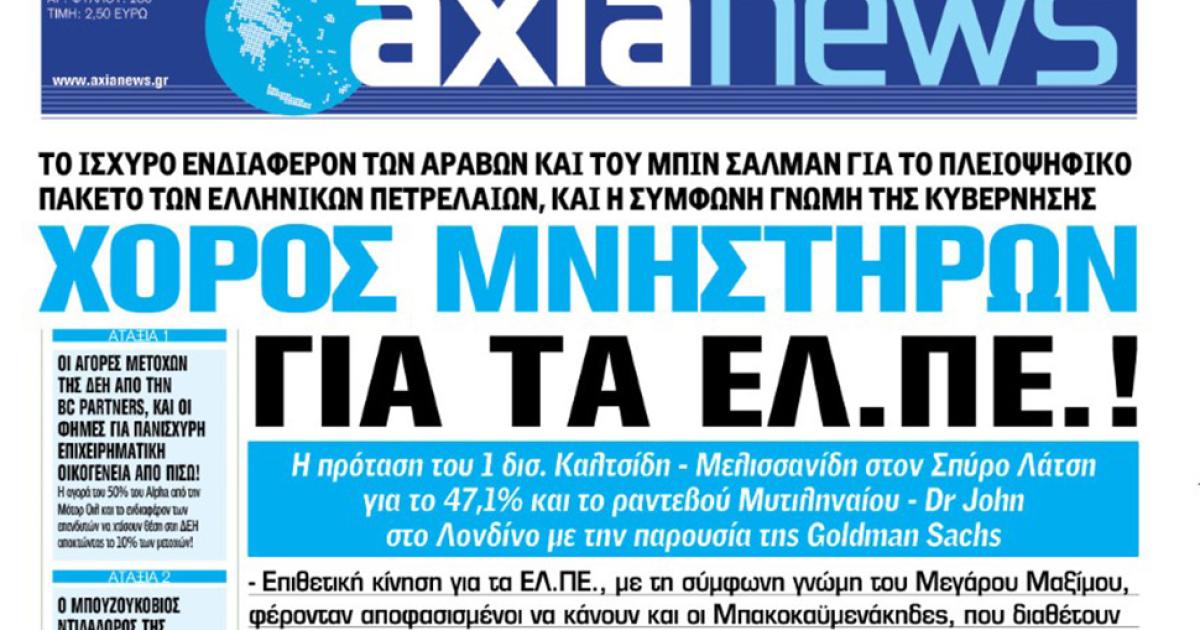 Με τίτλο: «Χορός μνηστήρων για τα ΕΛ.ΠΕ.» κυκλοφορεί αύριο, Σάββατο 30 Ιουλίου η «Axianews».