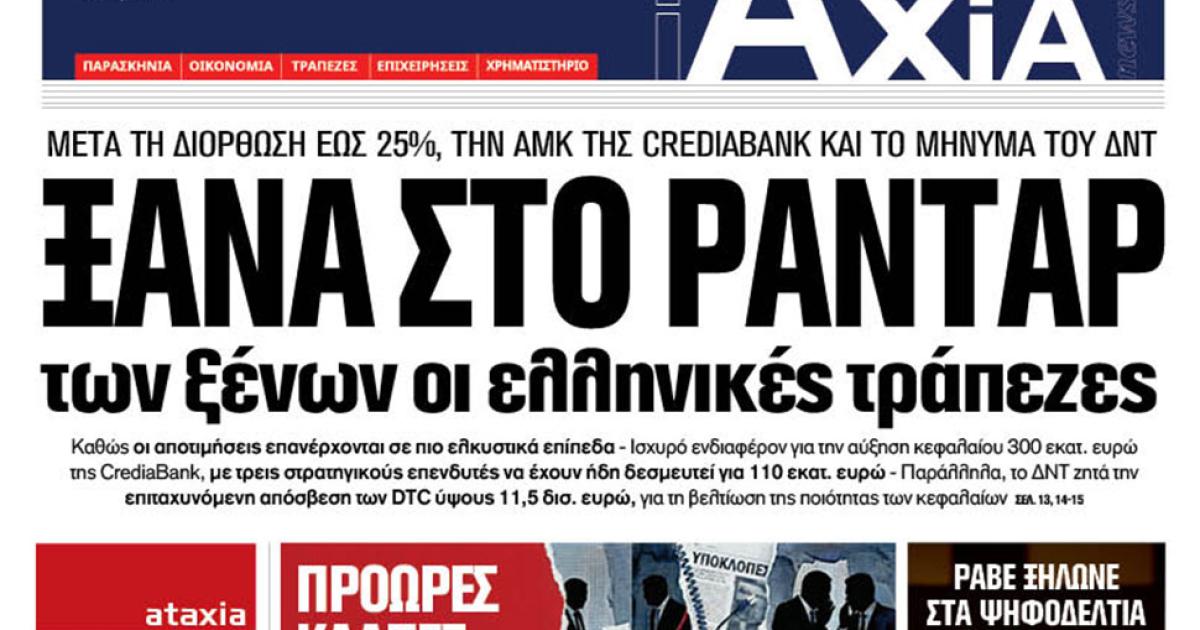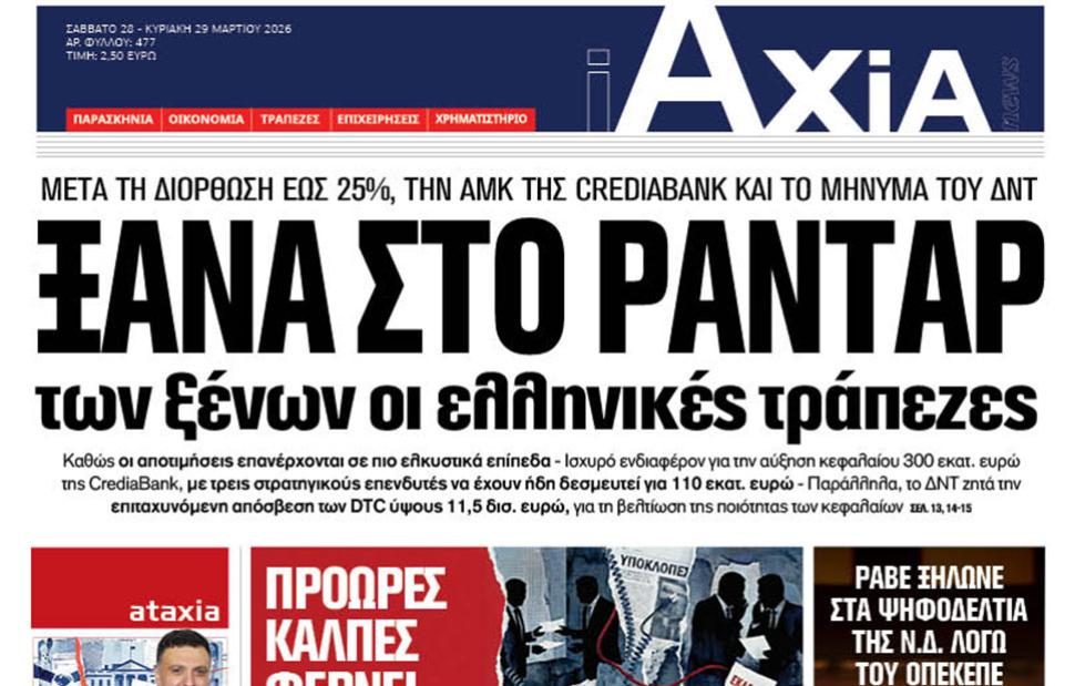 Με τίτλο: «Ξανά στο ραντάρ των ξένων οι ελληνικές τράπεζες» κυκλοφορεί αύριο, Σάββατο 28 Μαρτίου, η «iAxia».
