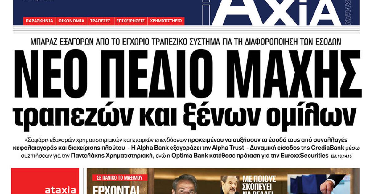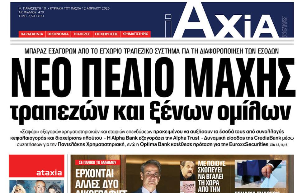 Με τίτλο: «Νέο πεδίο μάχης τραπεζών και ξένων ομίλων» κυκλοφορεί εκτάκτως αύριο, Μεγάλη Παρασκευή 10 Απριλίου, η «iAxia».