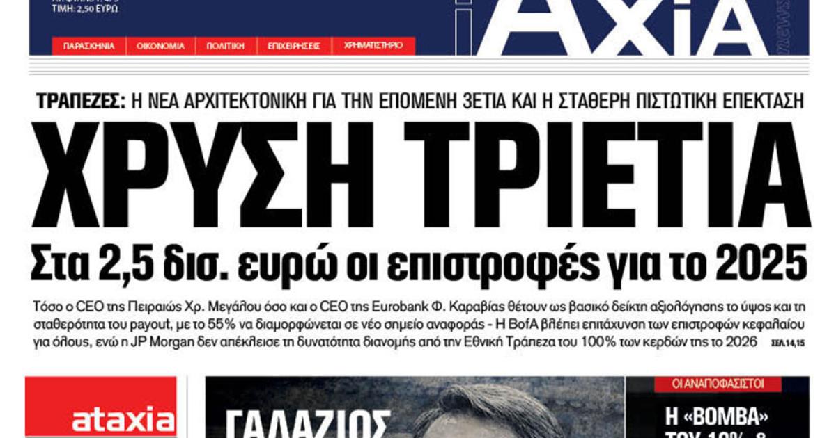 Με τίτλο: «Χρυσή τριετία - Στα 2,5 δισ. ευρώ οι επιστροφές για το 2025» κυκλοφορεί αύριο, Σάββατο 28 Φεβρουαρίου, η «iAxia».