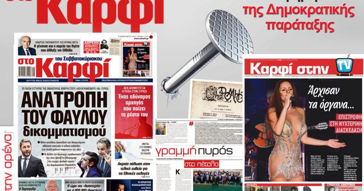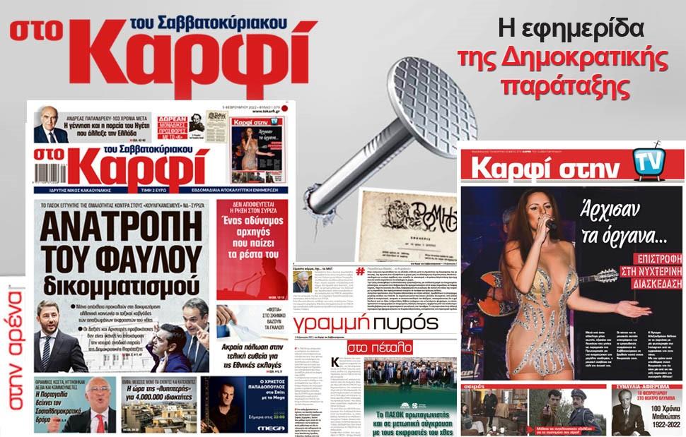 Μη χάσετε αυτό το Σάββατο 5 Φεβρουαρίου 2022 το αποκαλυπτικό «ΚΑΡΦΙ» που κυκλοφορεί σε όλα τα περίπτερα της χώρας με πλούσια θεματολογία και πολλές αποκλειστικότητες.