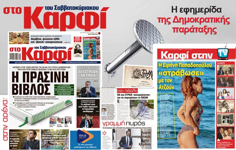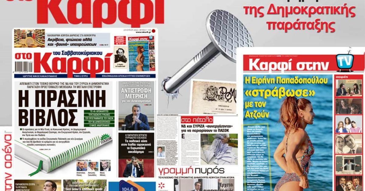 Μη χάσετε το Σάββατο 23 Ιουλίου 2022 το αποκαλυπτικό «ΚΑΡΦΙ» που κυκλοφορεί σε όλα τα περίπτερα της χώρας με πλούσια θεματολογία και πολλές αποκλειστικότητες.