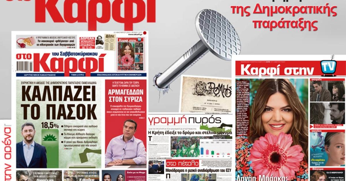 Μη χάσετε αυτό το Σάββατο 22 Ιανουαρίου 2022 το αποκαλυπτικό «ΚΑΡΦΙ» που κυκλοφορεί σε όλα τα περίπτερα της χώρας με πλούσια θεματολογία και πολλές αποκλειστικότητες