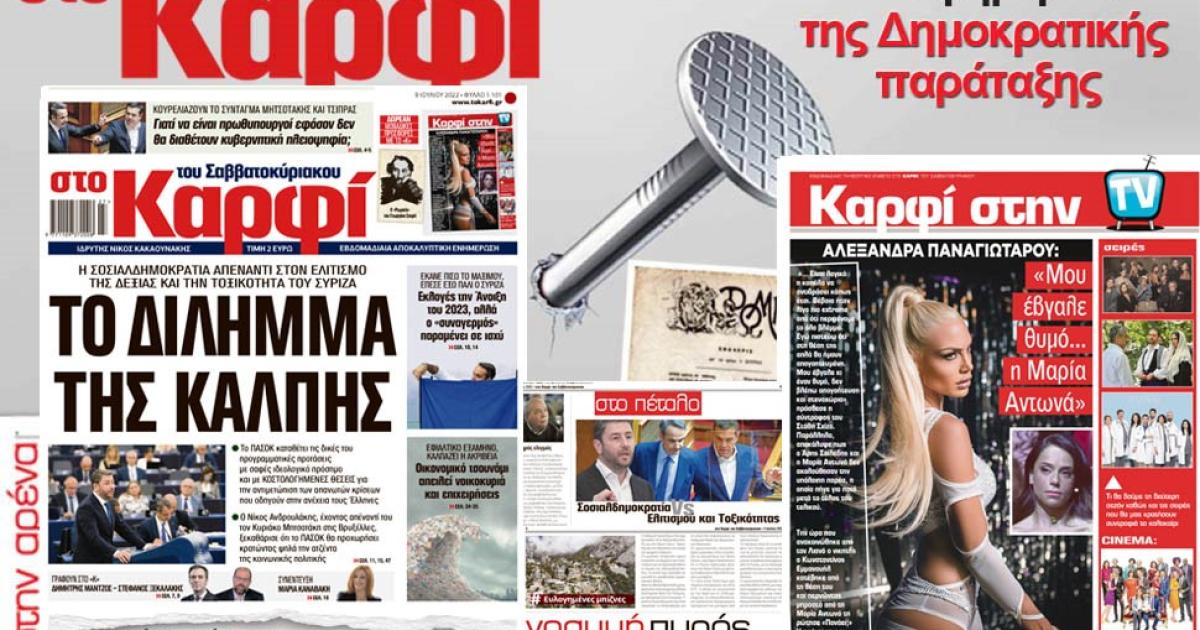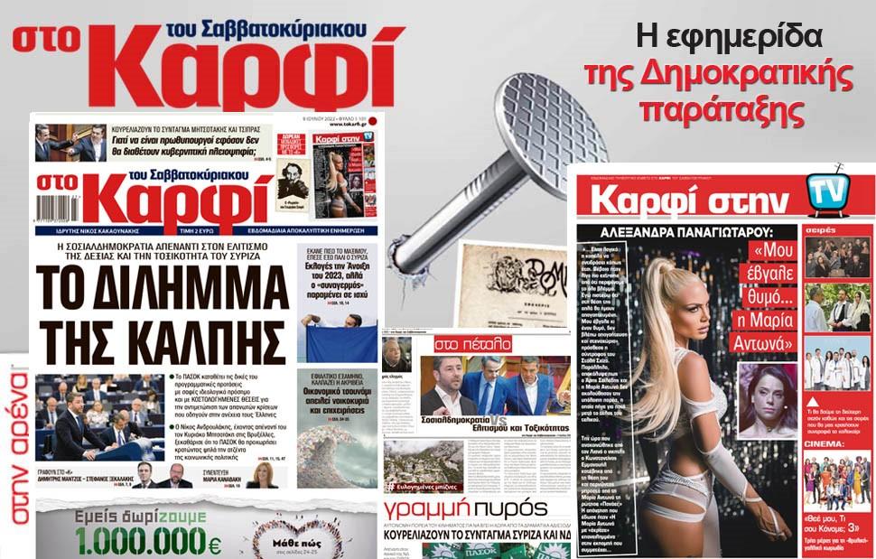 Μη χάσετε το Σάββατο 9 Ιουλίου 2022 το αποκαλυπτικό «ΚΑΡΦΙ» που κυκλοφορεί σε όλα τα περίπτερα της χώρας με πλούσια θεματολογία και πολλές αποκλειστικότητες.