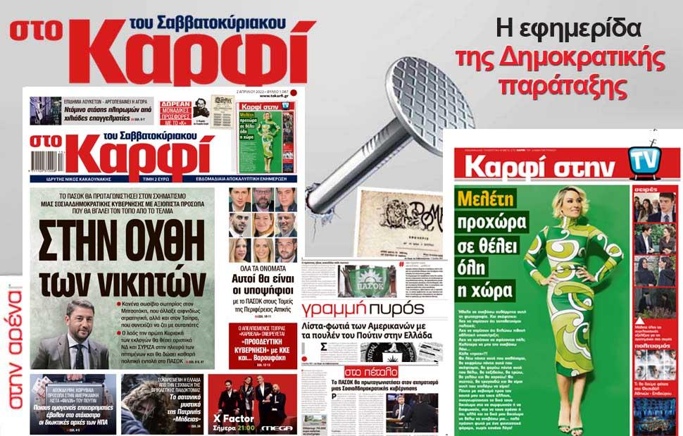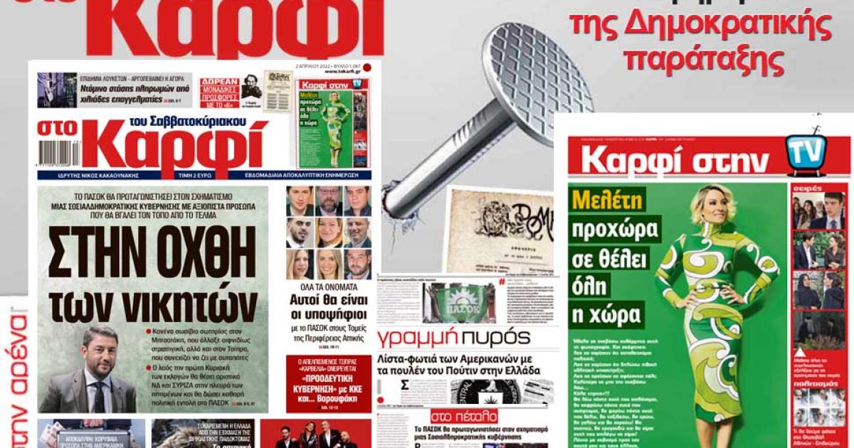 Μη χάσετε αυτό το Σάββατο 2 Απριλίου 2022 το αποκαλυπτικό «ΚΑΡΦΙ» που κυκλοφορεί σε όλα τα περίπτερα της χώρας με πλούσια θεματολογία και πολλές αποκλειστικότητες.