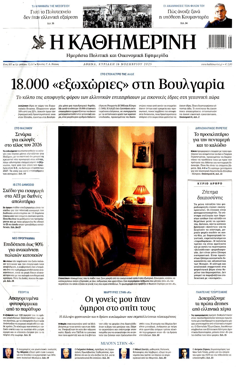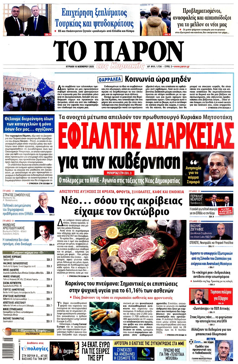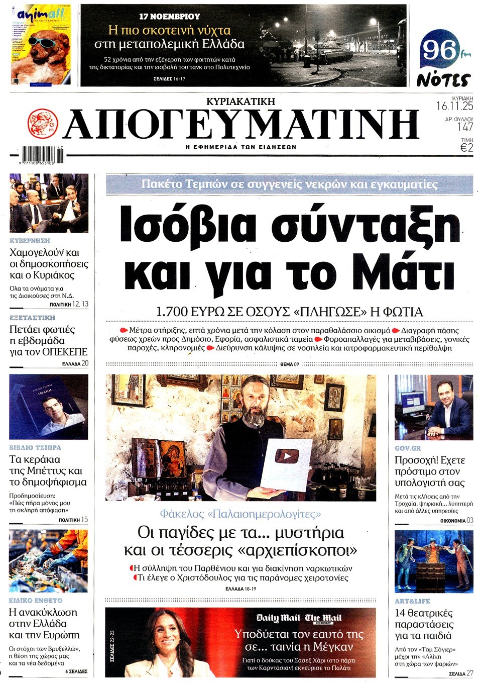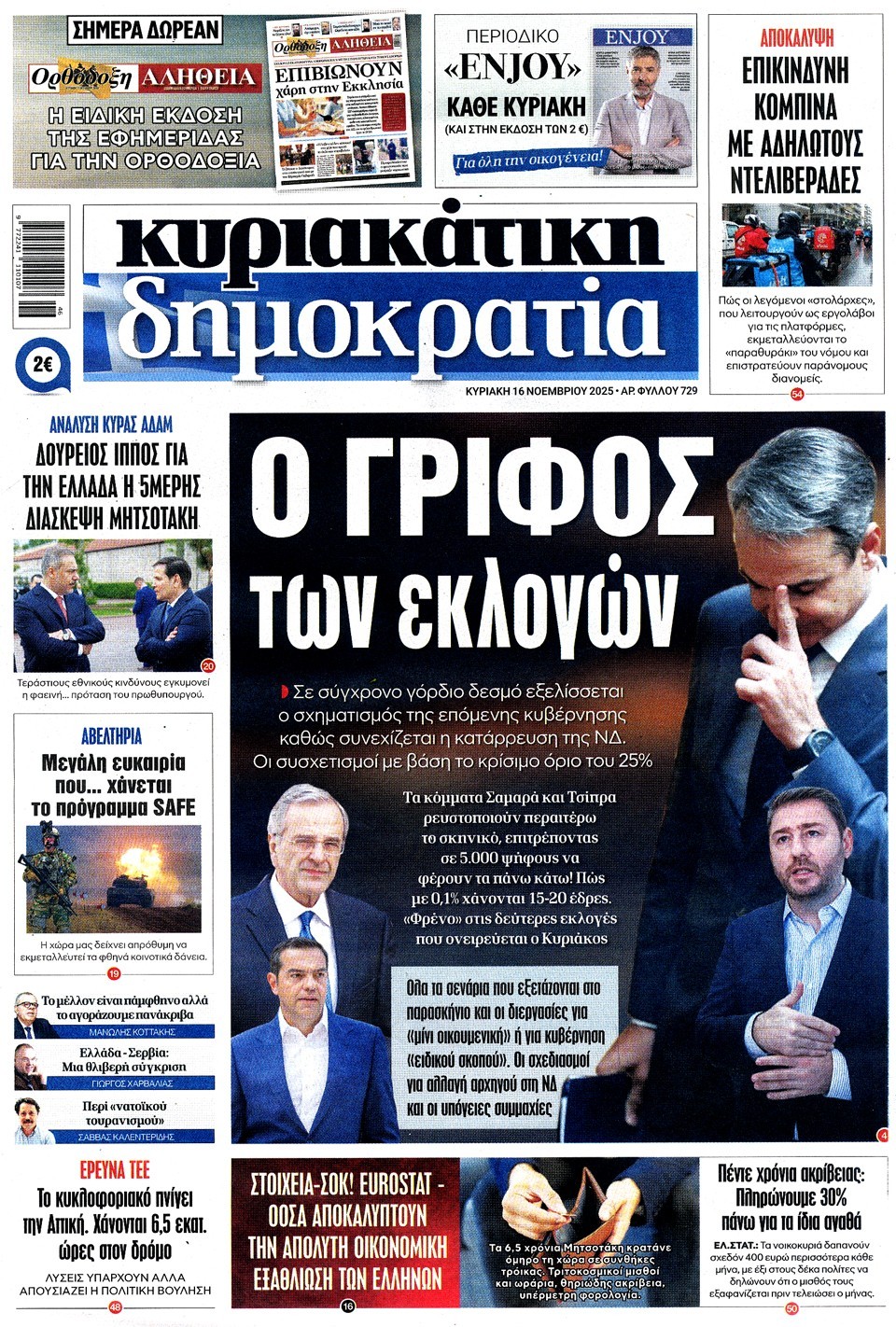 Διαβάστε τα πρωτοσέλιδα των εφημερίδων της Κυριακής 16 Νοεμβρίου 2025
