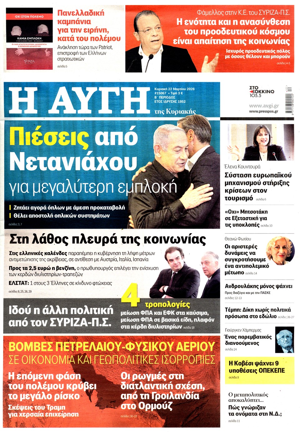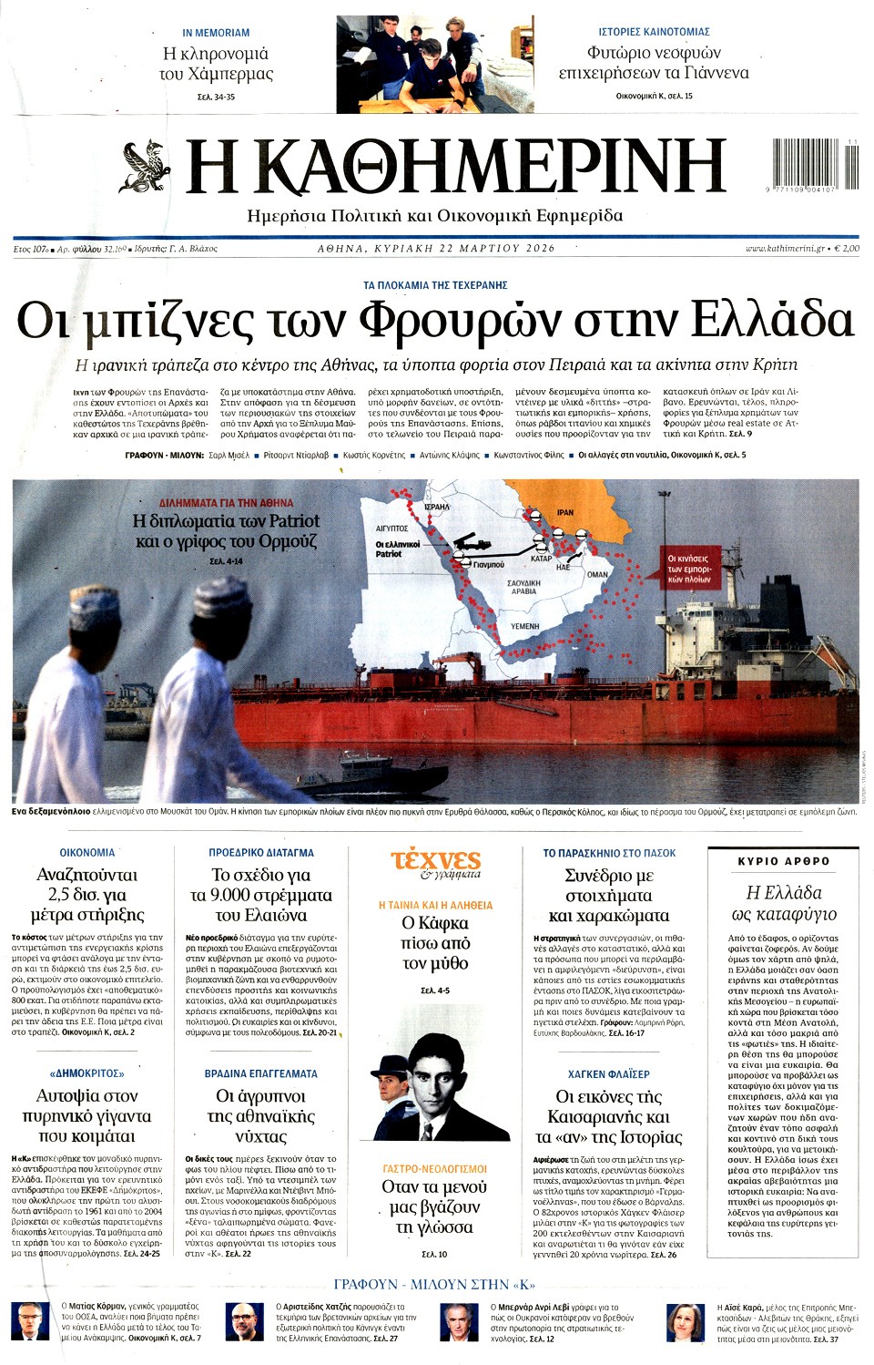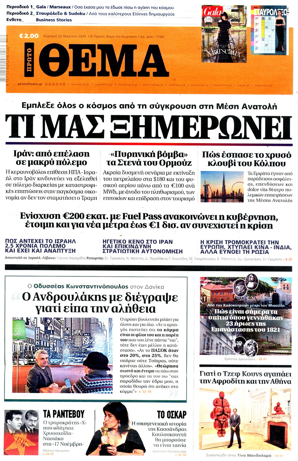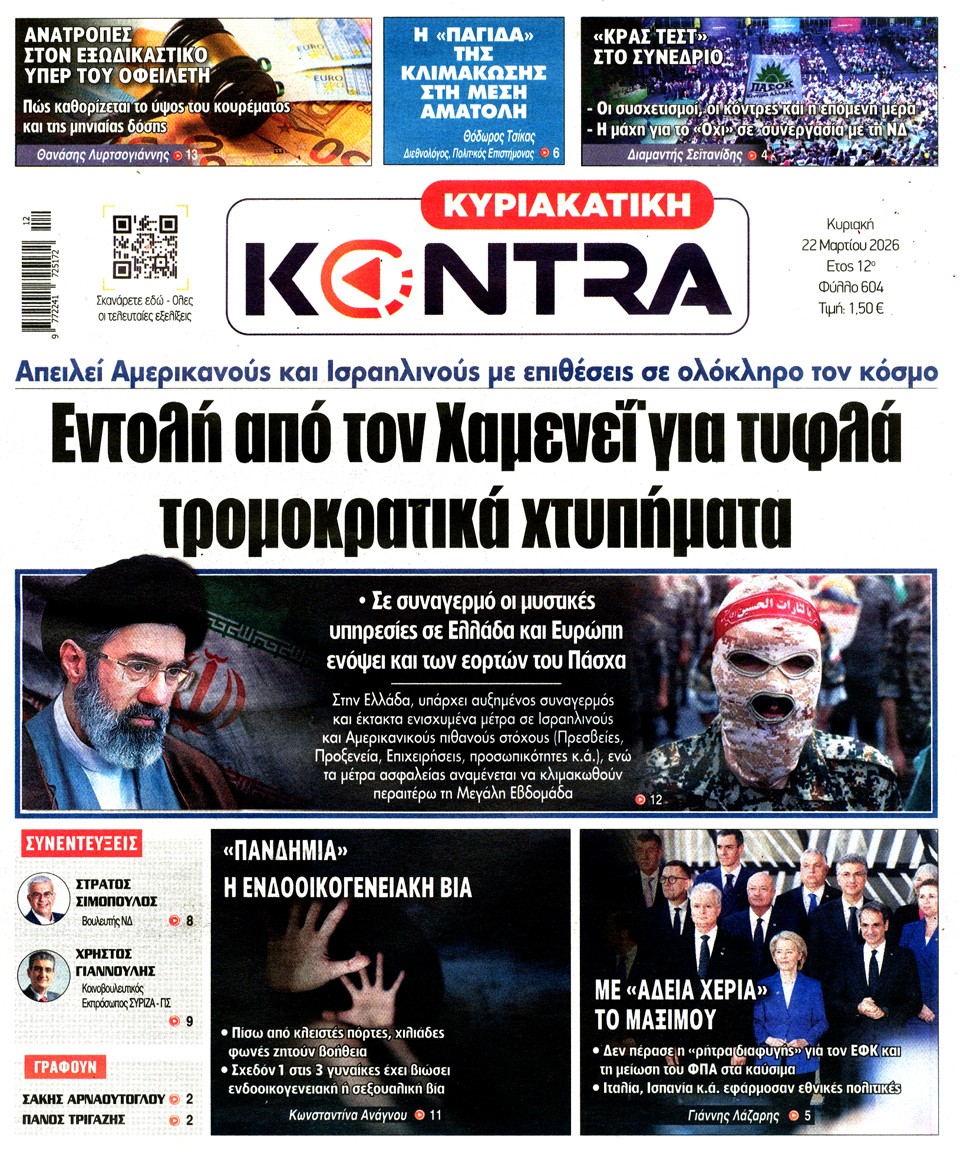Διαβάστε τα πρωτοσέλιδα των εφημερίδων της Κυριακής 15 Μαρτίου 2026
