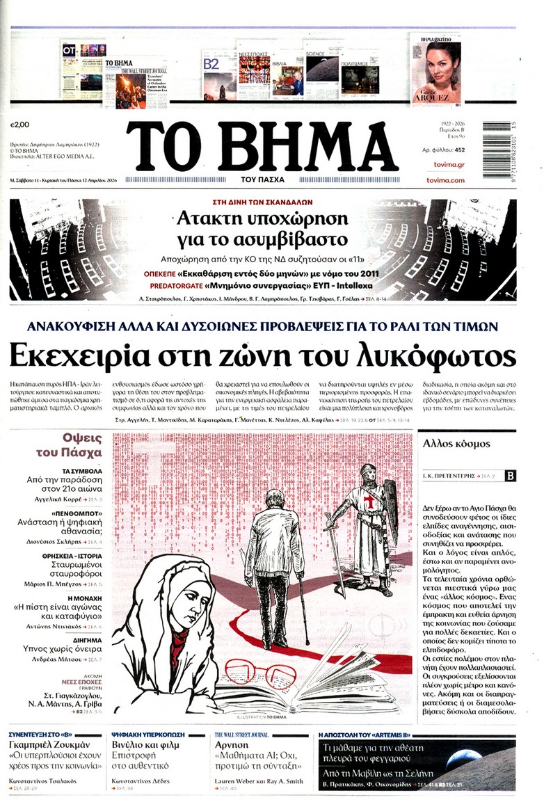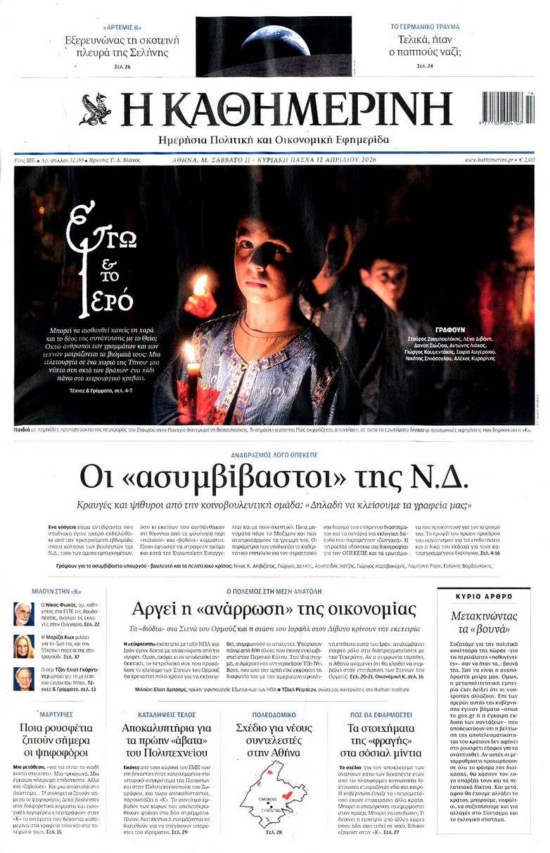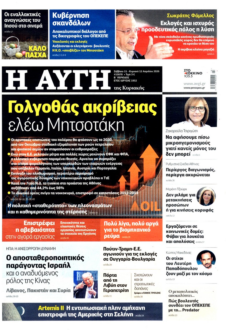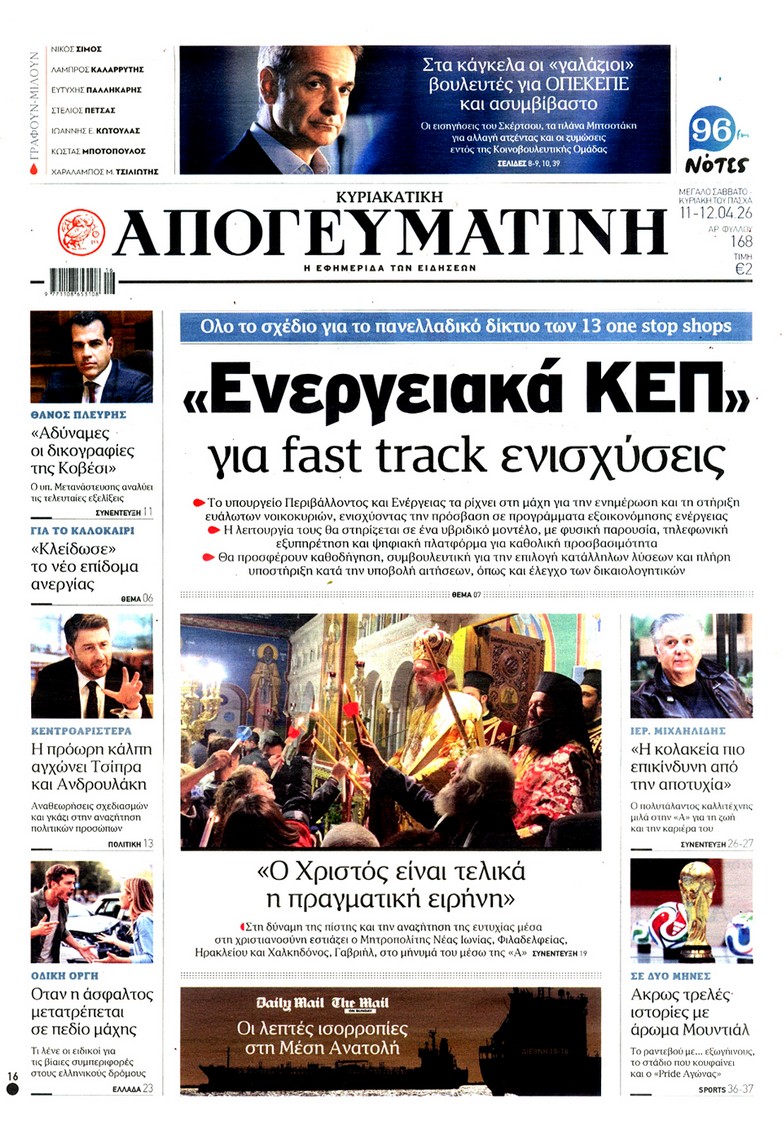 Δείτε τα πρωτοσέλιδα των κυριακάτικων εφημερίδων που κυκλοφορούν εκτάκτως το Μεγάλο Σάββατο 11 Απριλίου.