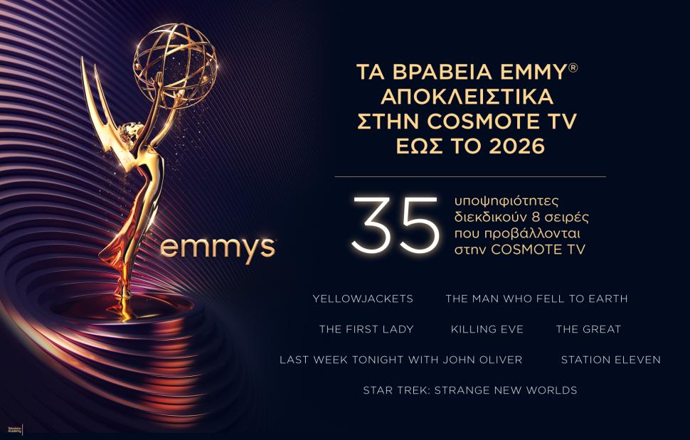 Τα βραβεία Emmy, έναν από τους μεγαλύτερους τηλεοπτικούς θεσμούς παγκοσμίως, που τιμά τις καλύτερες ερμηνείες και σειρές που ξεχωρίζουν κάθε χρόνο στη «μικρή οθόνη», εξασφάλισε αποκλειστικά για τους συνδρομητές της έως το 2026, η COSMOTE TV. To πρώτο ραντεβού των τηλεθεατών της με τα Emmy θα δοθεί την Τρίτη 13/9, για την 74η τελετή απονομής.