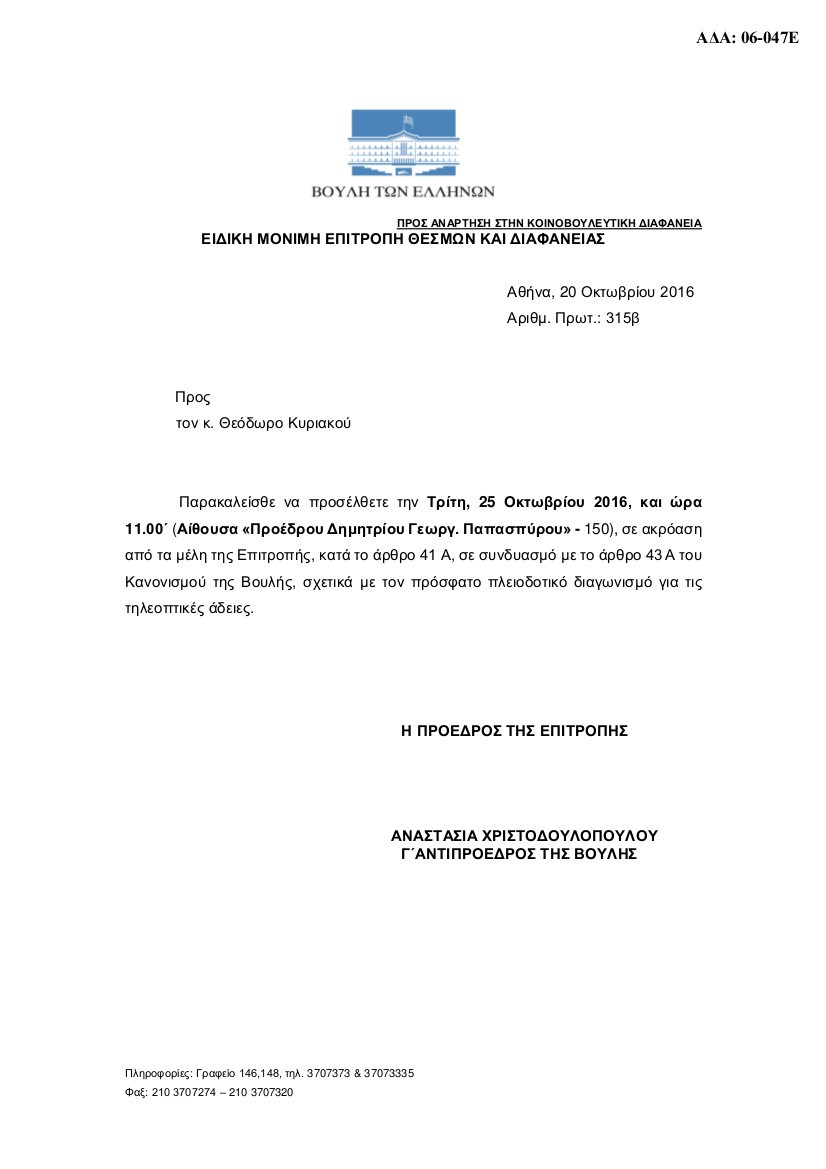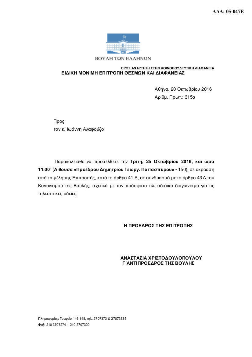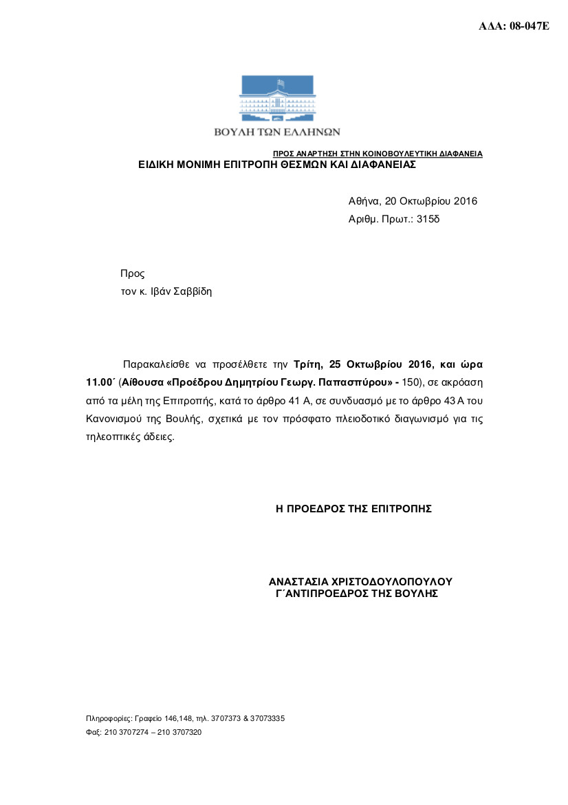 Η επιτροπή θεσμών και διαφάνειας της Βουλής έστειλε στους τέσσερις υπερθεματιστές πρόσκληση για ακρόαση.