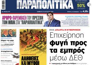 Aύριο Σάββατο 27 Αυγούστου, η εφημερίδα ΠΑΡΑΠΟΛΙΤΙΚΑ κυκλοφορεί σε όλα τα περίπτερα της χώρας με πλούσια θεματολογία και πολλές αποκλειστικότητες. Απο...