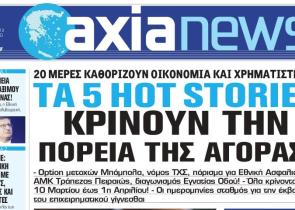 Με τίτλο: «Τα 5 hot stories κρίνουν την πορεία της Αγοράς!» κυκλοφορεί αύριο, Σάββατο 6 Μαρτίου, η «Axianews». 20 μέρες καθορίζουν Οικονομία και Χρημ...