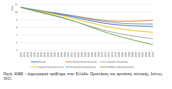 Ο συντελεστής γονιμότητας έχει υποχωρήσει σε επίπεδα κάτω από 1,5 μονάδες ήδη από τα τέλη της δεκαετίας του 1980, ενώ ήταν 2,1 - 2,5 μονάδες στις δεκαετίες των 1960 και 1970. Η μείωση του συντελεστή γονιμότητας και η γήρανση του πληθυσμού της χώρας προβλέπεται να συνεχιστούν τις επόμενες δεκαετίες. Στο σενάριο βάσης των δημογραφικών προβολών, ο πληθυσμός της Ελλάδας προβλέπεται να υποχωρήσει σε 8,1 εκατ. έως το 2100, δηλαδή μια μείωση του πληθυσμού κατά 2,5 εκατ. άτομα ή 24% σε σχέση με το 2021 όπως φαίνεται στο ακόλουθο διάγραμμα που παρουσιάζει διάφορα σενάρια εξέλιξης του πληθυσμού.