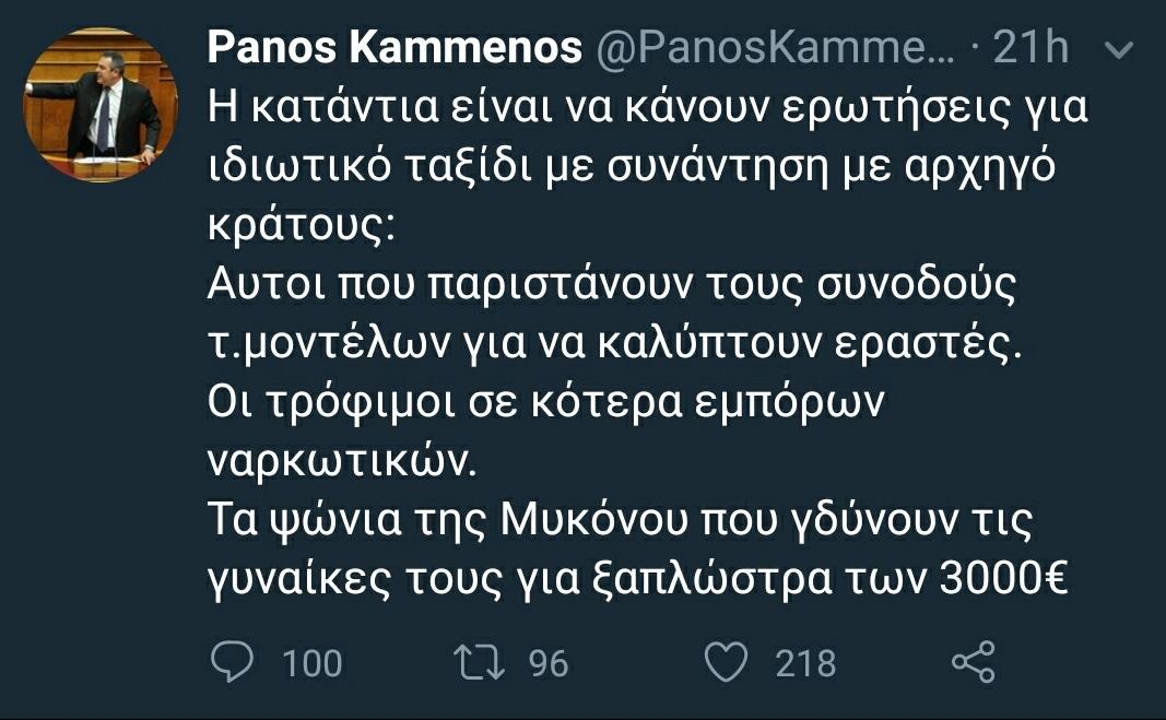 Όμως, οι μοναρχιολάγνοι αγωνιστές της Αριστεράς και οι πιστοί τους σύντροφοι, όπως ο Καμμένος ο Πάνος, απαντούν μόνο σε ερωτήσεις που διατυπώνουν άνθρωποι του δικού τους, πολύ υψηλού, επιπέδου. Και μέχρι τώρα κανένας τέτοιος άνθρωπος δεν αναρωτήθηκε τι δουλειά είχε ο υπουργός της Άμυνας της Πρώτης Φοράς Αριστεράς να περνάει το σαββατοκύριακό του στην πρωτεύουσα της χλιδής. Αντιθέτως, όλοι οι σοβαροί άνθρωποι, αυτοί που δικαιούνται να ρωτήσουν τον Καμμένο τον Πάνο για το, οπωσδήποτε ακριβό, ιδιωτικό ταξίδι, δεν αναρωτιούνται γιατί πήγε ο μπαρουτοκαπνισμένος πολέμαρχος στο Μονακό, αλλά γιατί δεν έμεινε εκεί για πάντα. Και μπράβο του.