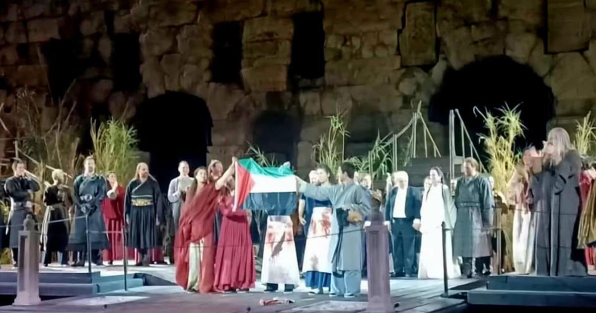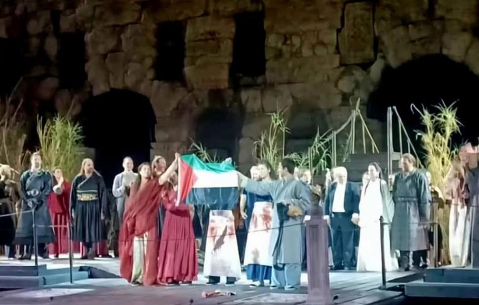 Είχε προηγηθεί η παράσταση της όπερας του Τζάκομο Πουτσίνι «Τουραντότ», που ανέβασε η Εθνική Λυρική Σκηνή. Μετά την λήξη της παράστασης, με πρωτοβουλία του Σωματείου Εργαζομένων στον Χώρο του Χορού (Σ.Ε.ΧΩ.ΧΟ), κάποιοι από τους συντελεστές της, για να εκφράσουν, με δημοκρατικό και κυρίως «πρωτότυπο» τρόπο, την αλληλεγγύη τους προς τον λαό της Παλαιστίνης, ύψωσαν υπερηφάνως την σημαία της!