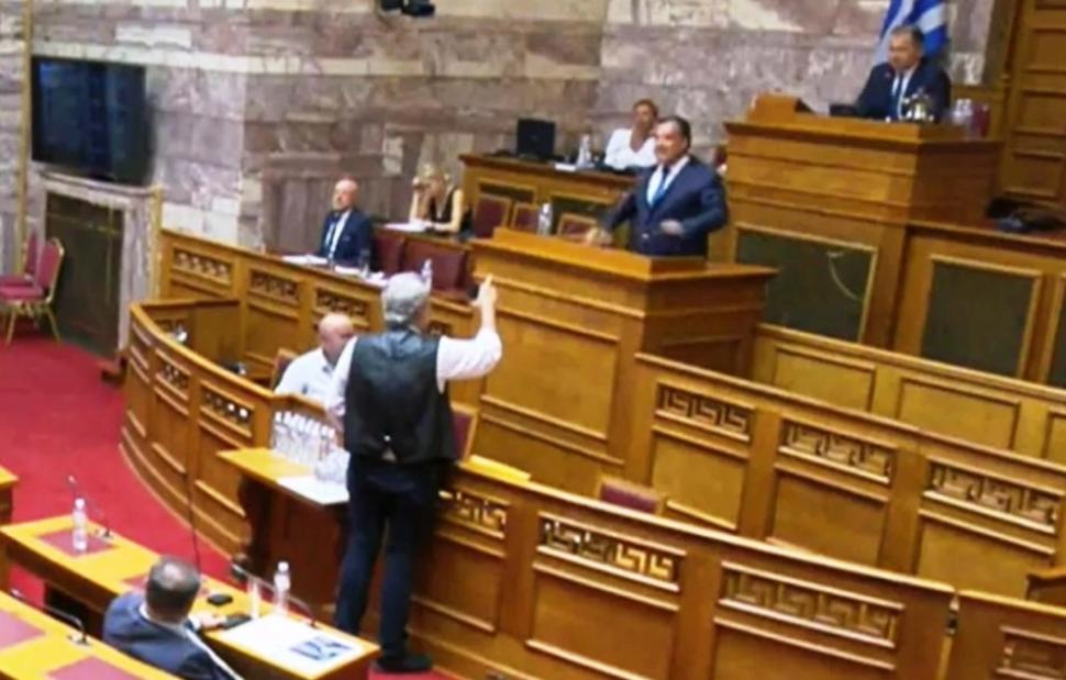 Άδωνις Γεωργιάδης: Προκαλέσατε και άλλη φορά. Σε μένα δεν μπορείς να κάνεις αυτά που έκανες στην κυρία Συρεγγέλα. Άρα κάτσε εδώ να ακούσεις. Φεύγεις; Βάλτο στα πόδια. Τέτοιος δειλός ήσουν πάντα. Φύγε. Ουστ!