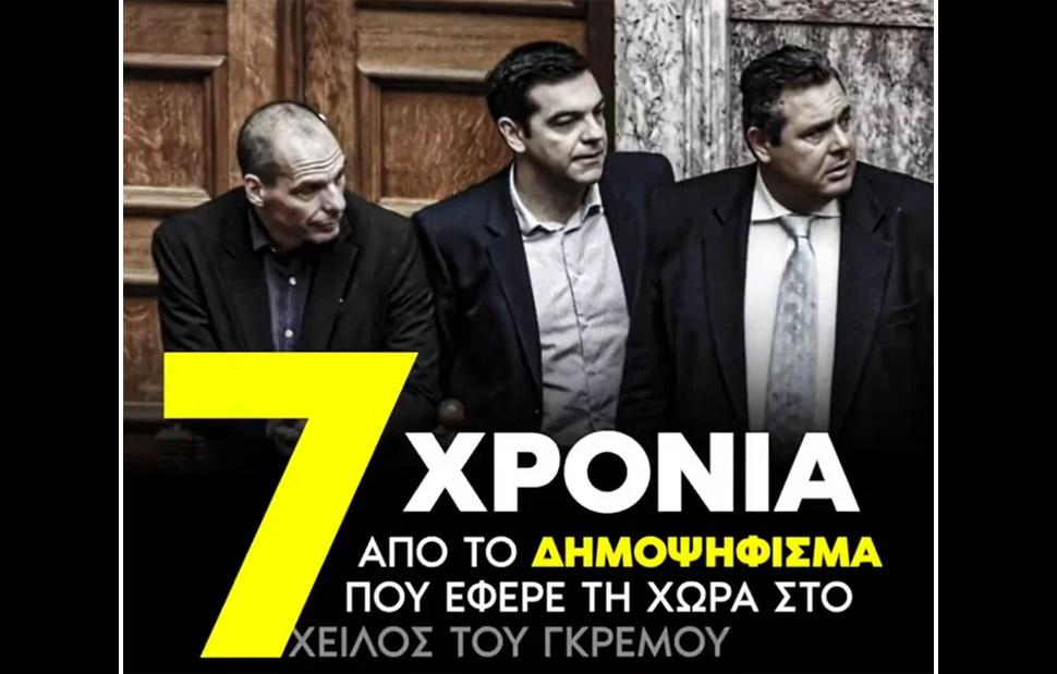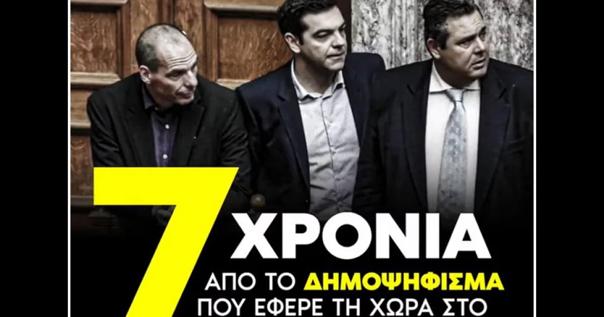 Στη συμπλήρωση 7 ετών από το αποτέλεσμα του δημοψηφίσματος του 2015 αναφέρεται με δηκτικό τρόπο η ΝΔ.