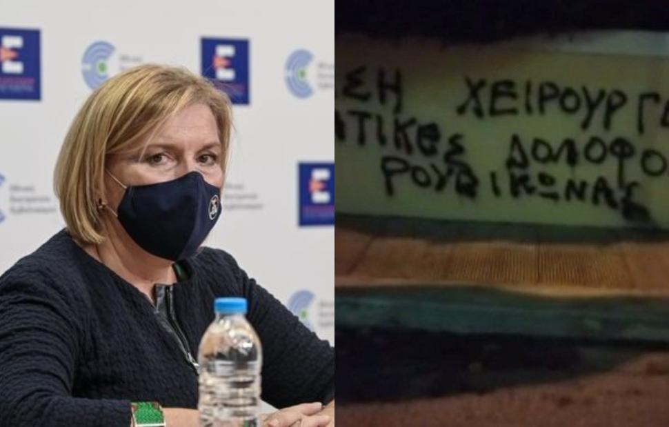 Σύνθημα με μπογιές που αφορούν στα χειρουργεία έγραψαν μέλη του Ρουβίκωνα λίγο μετά τα μεσάνυχτα στον τοίχο του σπιτιού της αναπληρώτριας υπουργού Υγείας, Μίνας Γκάγκα.