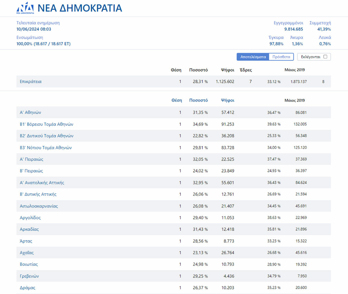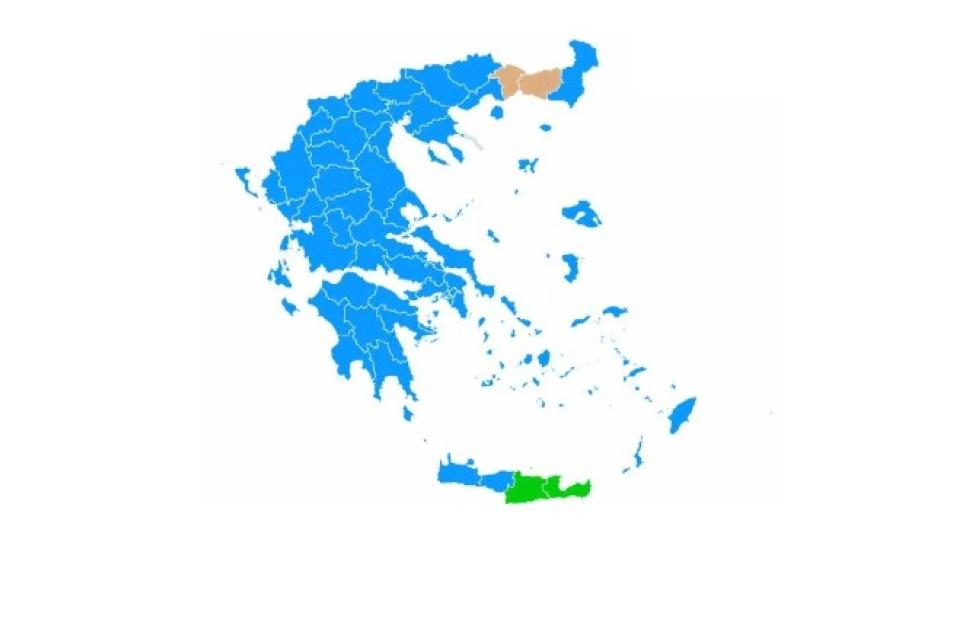 Μπλε βάφτηκε ο εκλογικός χάρτης της Ελλάδας, καθώς η Νέα Δημοκρατία ήταν πρώτη σε όλες τις εκλογικές περιφέρειες, εκτός από δύο στην Κρήτη, όπου βγήκε πρώτο το ΠΑΣΟΚ και δύο στη Θράκη, όπου την πρωτιά κέρδισε το μουσουλμανικό Κόμμα Ισότητας, Ειρήνης και Φιλίας.