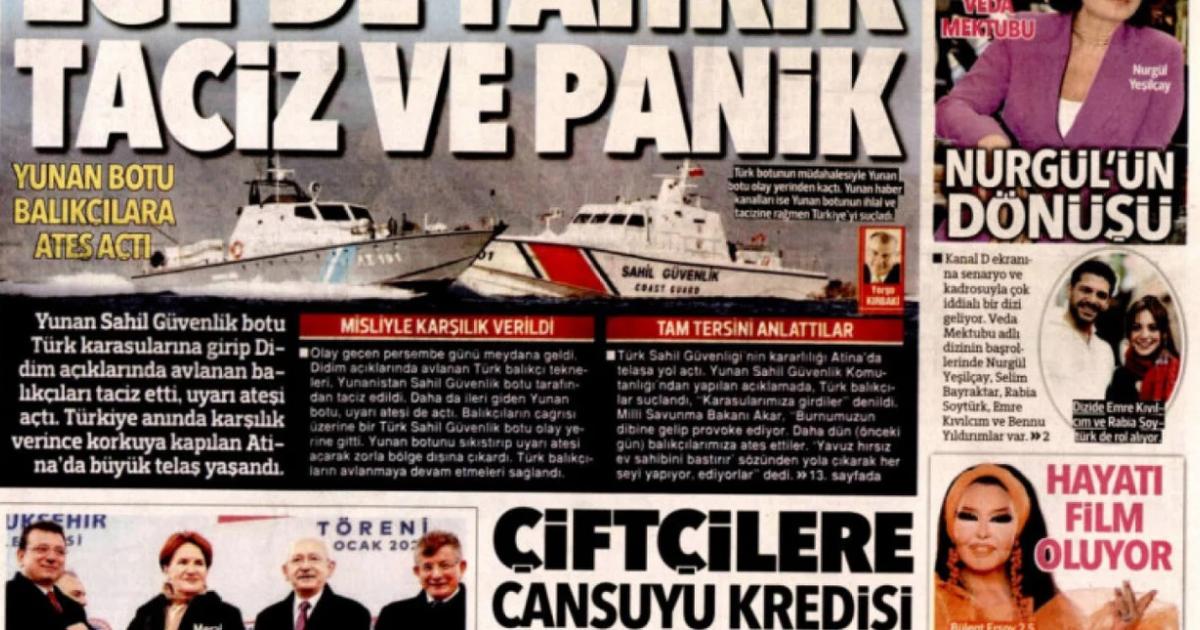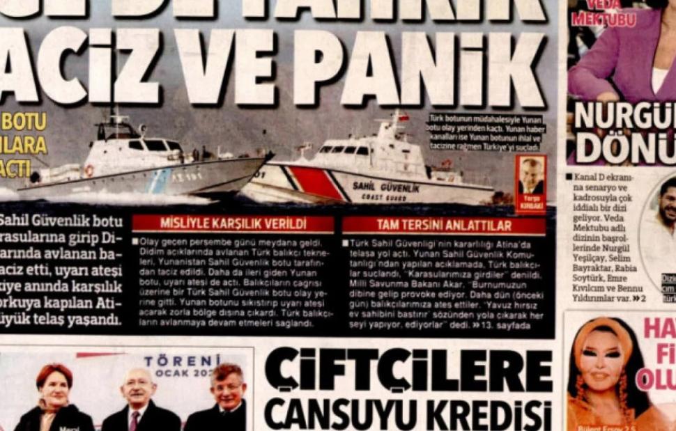 Συγκεκριμένα η Hurriyet αναφέρει στον τίτλο της: «Πρόκληση, παρενόχληση και πανικός στο Αιγαίο», ενώ σημειώνει ότι «ελληνικό σκάφος πυροβόλησε στους τούρκους αλιείς», ενώ στο άρθρο κάνει λόγο για φόβο και πανικό στην Αθήνα. Παράλληλα στο ρεπορτάζ της, η εφημερίδα αναφέρει: