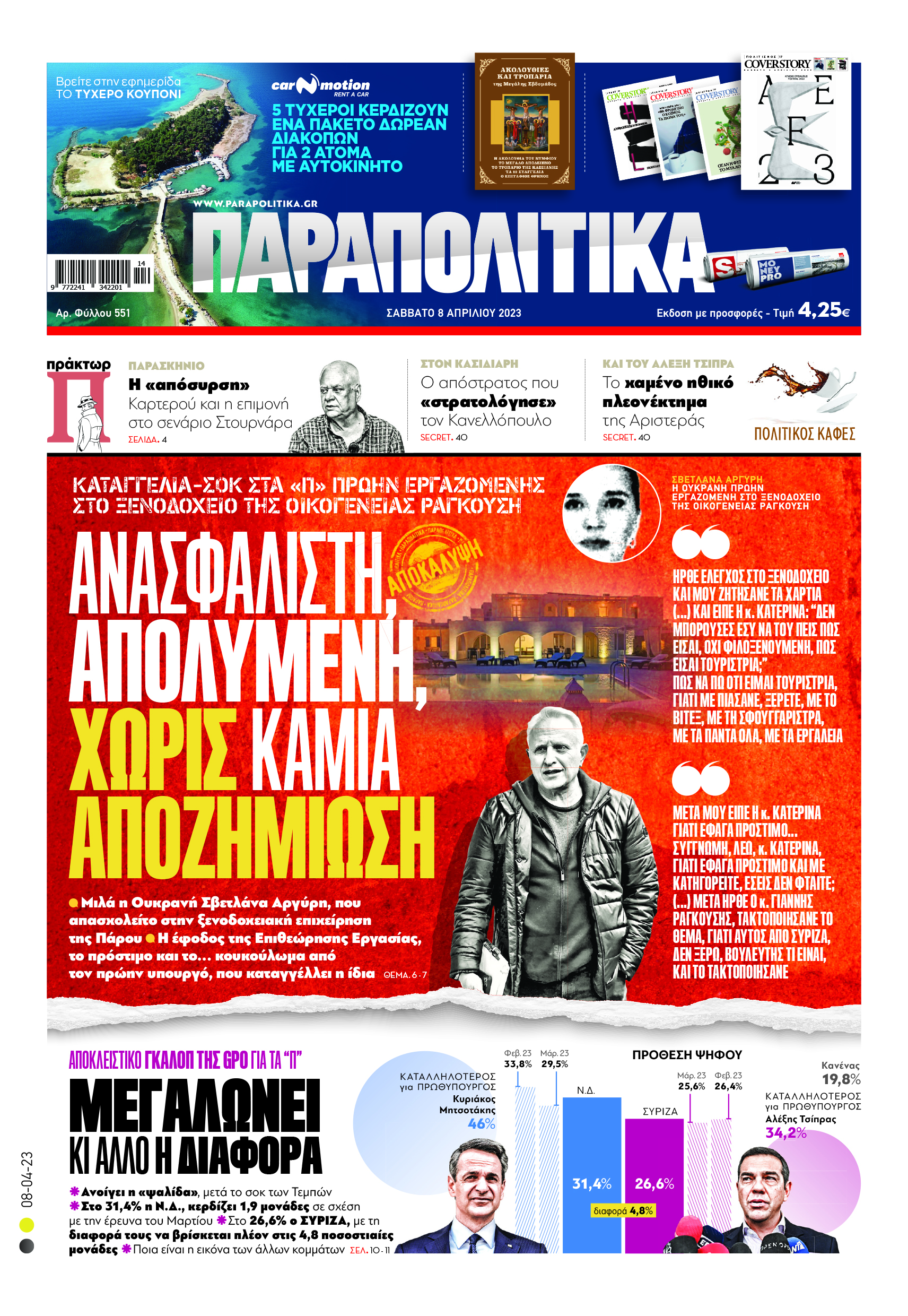 Με μια αποκάλυψη – «βόμβα» κυκλοφορούν σήμερα τα ΠΑΡΑΠΟΛΙΤΙΚΑ, η οποία έχει να κάνει με την επώνυμη καταγγελία, για ανασφάλιστη εργασία, πρώην εργαζόμενης (καθαρίστριας) στο ξενοδοχείο «Βίλα Ειρήνη» που διαθέτει η οικογένεια της πρώην συζύγου του Γιάννη Ραγκούση στην Πάρο.