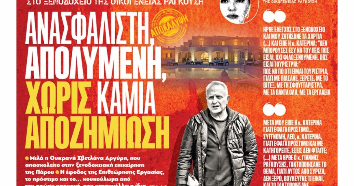 Όπως αναφέρεται στο ρεπορτάζ που υπογράφει ο Θανάσης Φουσκίδης «Μία μαρτυρία-σοκ, που έρχεται να δώσει νέες διαστάσεις στην υπόθεση των αποκαλύψεων για την επιχειρηματική δράση της οικογένειας Ραγκούση στον τουρισμό, δημοσιεύουν σήμερα τα «Παραπολιτικά». Πρόκειται για μία πρώην εργαζόμενη στο κομμάτι της καθημερινής φροντίδας των δωματίων του ξενοδοχείου «Βίλα Ειρήνη», που διαθέτει η οικογένεια της πρώην συζύγου του Γιάννη Ραγκούση, Κατερίνας Ρούσσου, στη Νάουσα της Πάρου. Όπως καταγγέλλει η κυρία Σβετλάνα Αργύρη (σ.σ. Φωτεινή, για τους εν Ελλάδι φίλους και γνωστούς), ουκρανικής καταγωγής, παντρεμένη με Έλληνα πολίτη με άδεια παραμονής σε ισχύ, η ίδια εργαζόταν στη συγκεκριμένη επιχείρηση κατά την περίοδο 2016-2017 χωρίς να έχει ασφαλιστεί βάσει του νόμου, γεγονός που η ίδια έμαθε με ιδιαίτερα επώδυνο τρόπο. Για την ιστορία και μόνο, επισημαίνεται πως εκείνο το διάστημα ο Γιάννης Ραγκούσης και η Κατερίνα Ρούσσου ήταν ακόμη παντρεμένοι, αφού μέχρι και για τη χρήση του 2018 πραγματοποιούσαν κοινή «πόθεν έσχες», παράμετρος που καταδεικνύει ότι είχαν ενεργούς (και) νομικούς δεσμούς».
