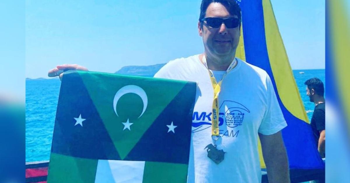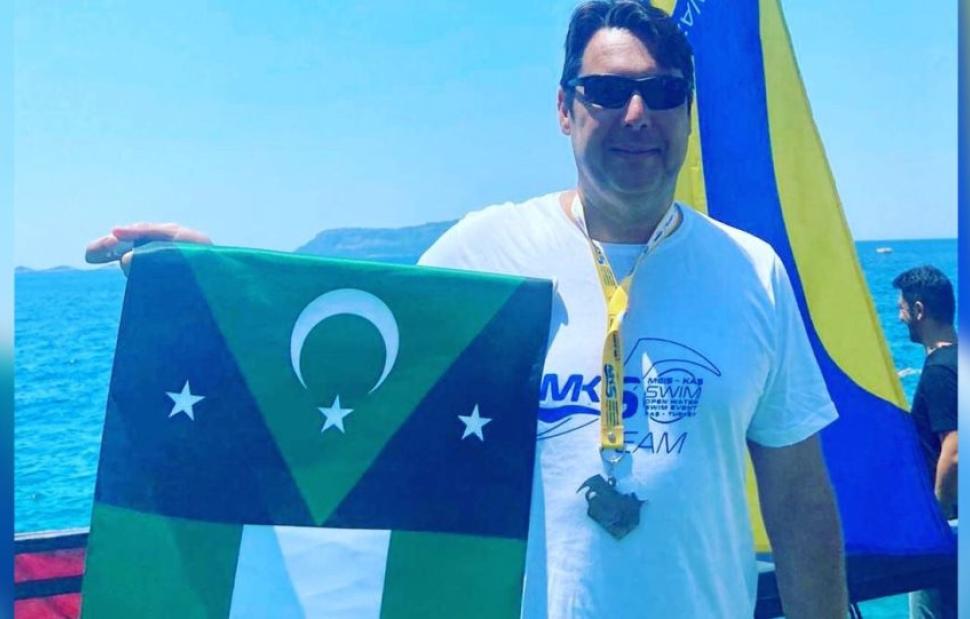 Μάλιστα ανέβασε και φωτογραφίες με τον ίδιο να κρατά τη σημαία της ανεξάρτητης Δυτικής Θράκης, όσο και τη διαδρομή που φέρετε να διέσχισε κολυμπώντας.