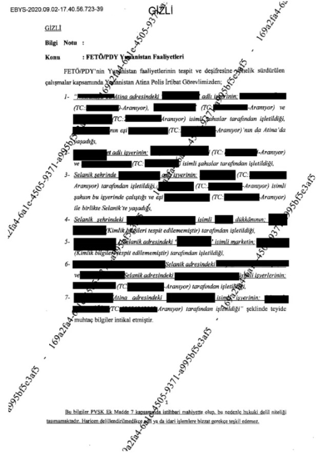 Στη συγκεκριμένη περίπτωση, το έγγραφο υπεγράφη από τον Ερντογάν Καρτάλ, αναπληρωτή αρχηγό του τμήματος αντιτρομοκρατίας της Emniyet, και διανεμήθηκε σε 10 τουρκικές επαρχίες σε ένα μυστικό μήνυμα για περαιτέρω αστυνομικές ενέργειες εναντίον Τούρκων υπηκόων που προβάλλονται από τον αστυνομικό στην τουρκική πρεσβεία στην Αθήνα.