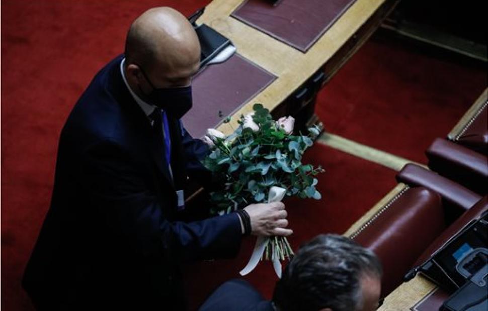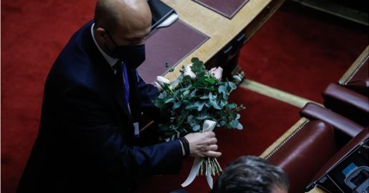 Στο έδρανό της Μαριέττας Γιαννάκου τοποθετήθηκαν λουλούδια, ως ελάχιστος φόρος τιμής στο πρόσωπό της.