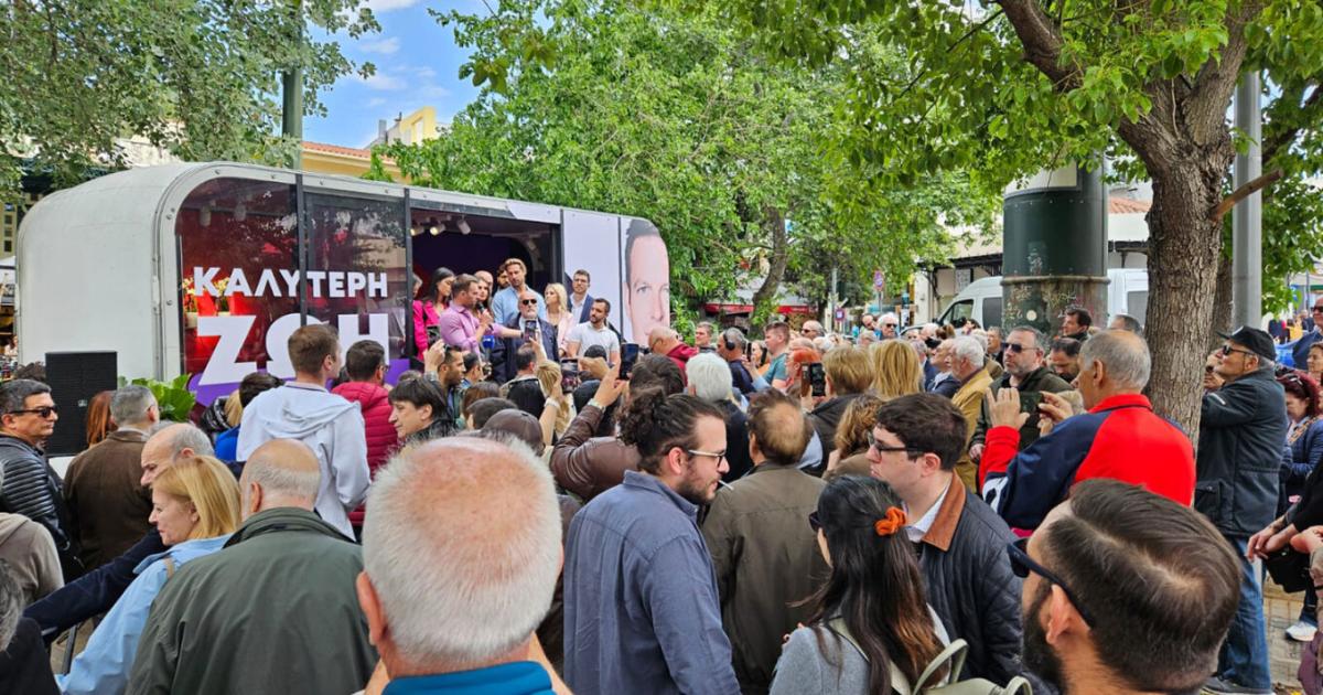 Ο αρχηγός της Αξιωματικής Αντιπολίτευσης απηύθυνε ομιλία από το τρέιλερ που έφτασε εχθές στην Ελλάδα από την Αγγλία και φέρει πάνω του το σύνθημα «Καλύτερη Ζωή Τώρα».