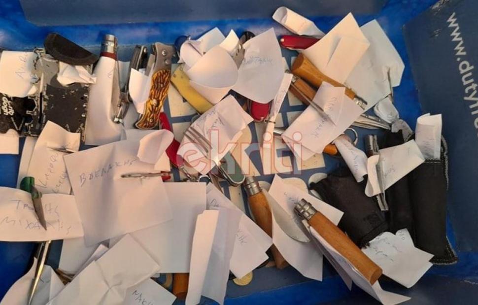 Οι αστυνομικοί καλούσαν τους πολίτες να αφήσουν μεταλλικά και άλλα αντικείμενα προκιμένου να μπουν στην αίθουσα και αίσθηση προκάλεσε το πόσοι μικροί σουγιάδες μαζεύτηκαν στο κουτι!