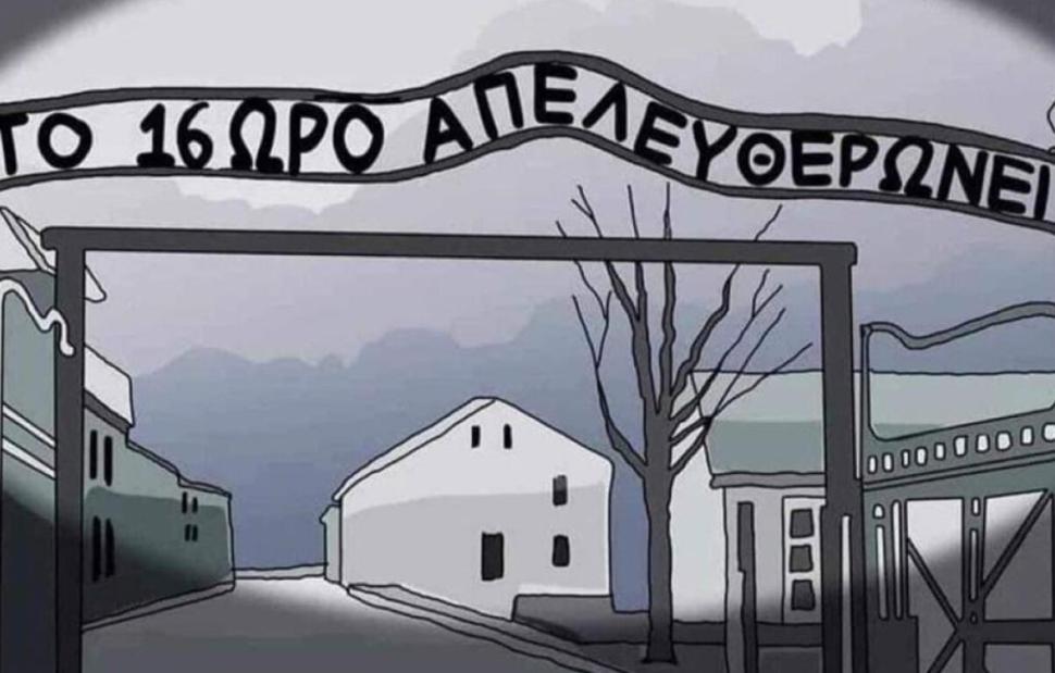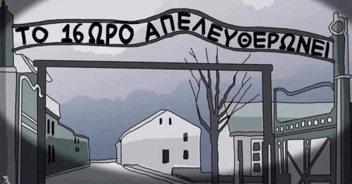 Στην ανάρτησή του, την οποία «κατέβασε» μετά από τις αντιδράσεις που προκάλεσε, ο κ. Καρίπογλου παρουσιάζει ένα σκίτσο με την είσοδο του στρατοπέδου Άουσβιτς και την επιγραφή «το 16ωρο απελευθερώνει».